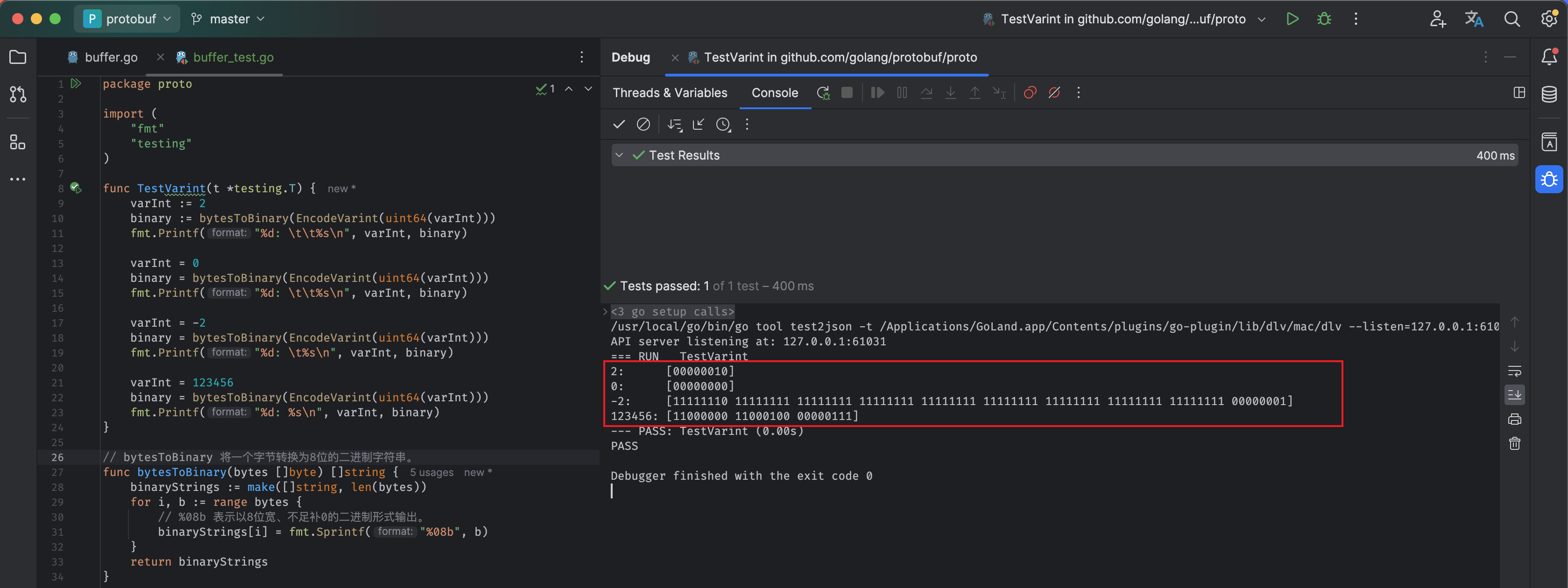 由于 protocol buffer 中大量使用了 varint 编码,可以在 此处 找到了对数据进行 varint 编解码的 Go 语言实现方法,实际在 库文件: encoding/protowire 实现代码中用位运算完成了上面说的 varint 编码过程。