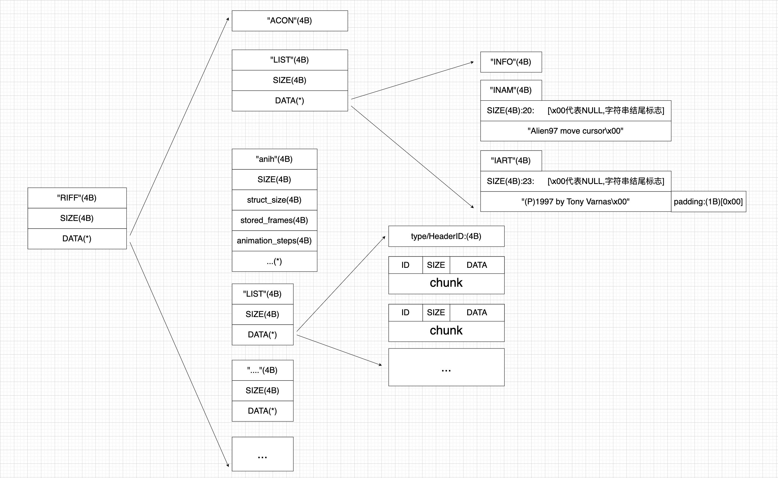 Microsoft在 AVI,WAV,以及接下来要介绍的 ANI 这些的文件格式中,都使用 RIFF 的格式当成它们的基础。结构组成 #