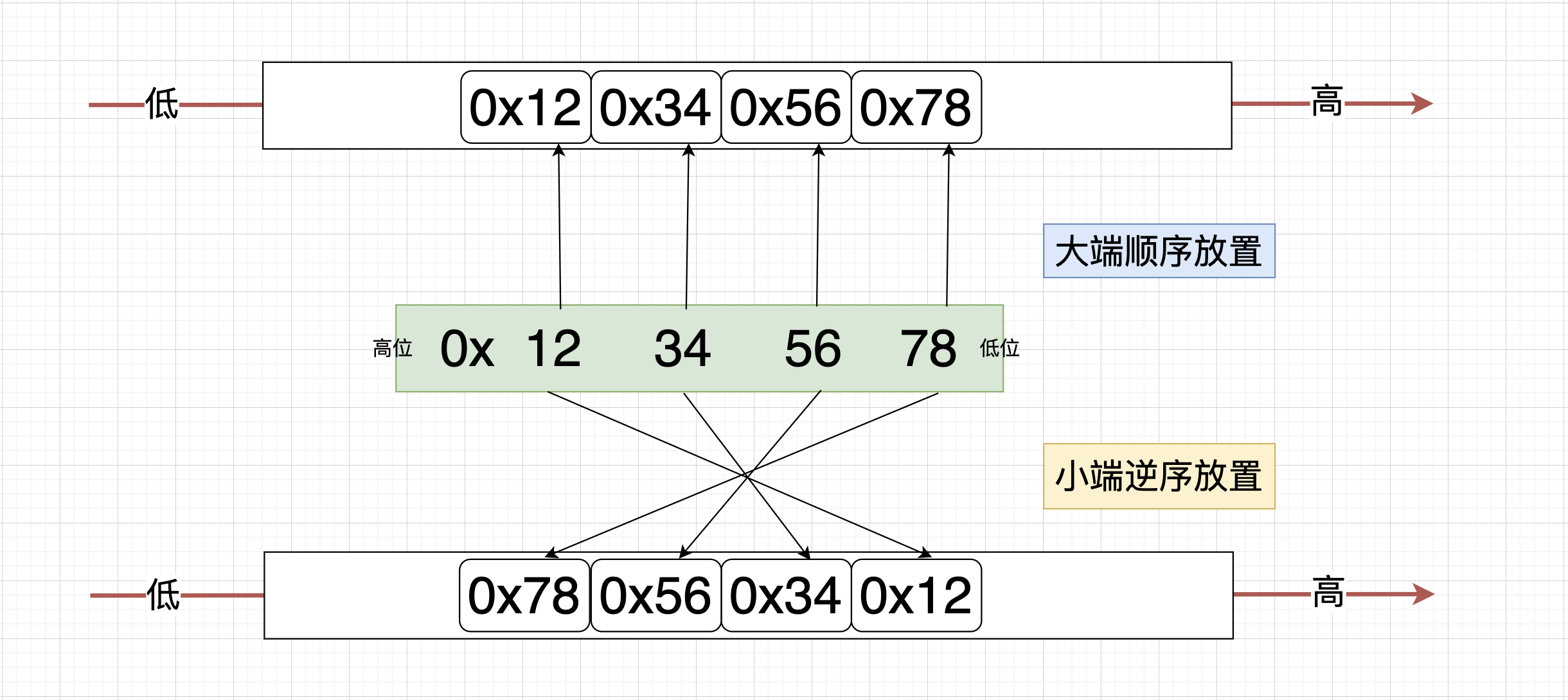 高位低地址,低位高地址被称为大端序(Big ),参考下图可以理解为 顺序放置。