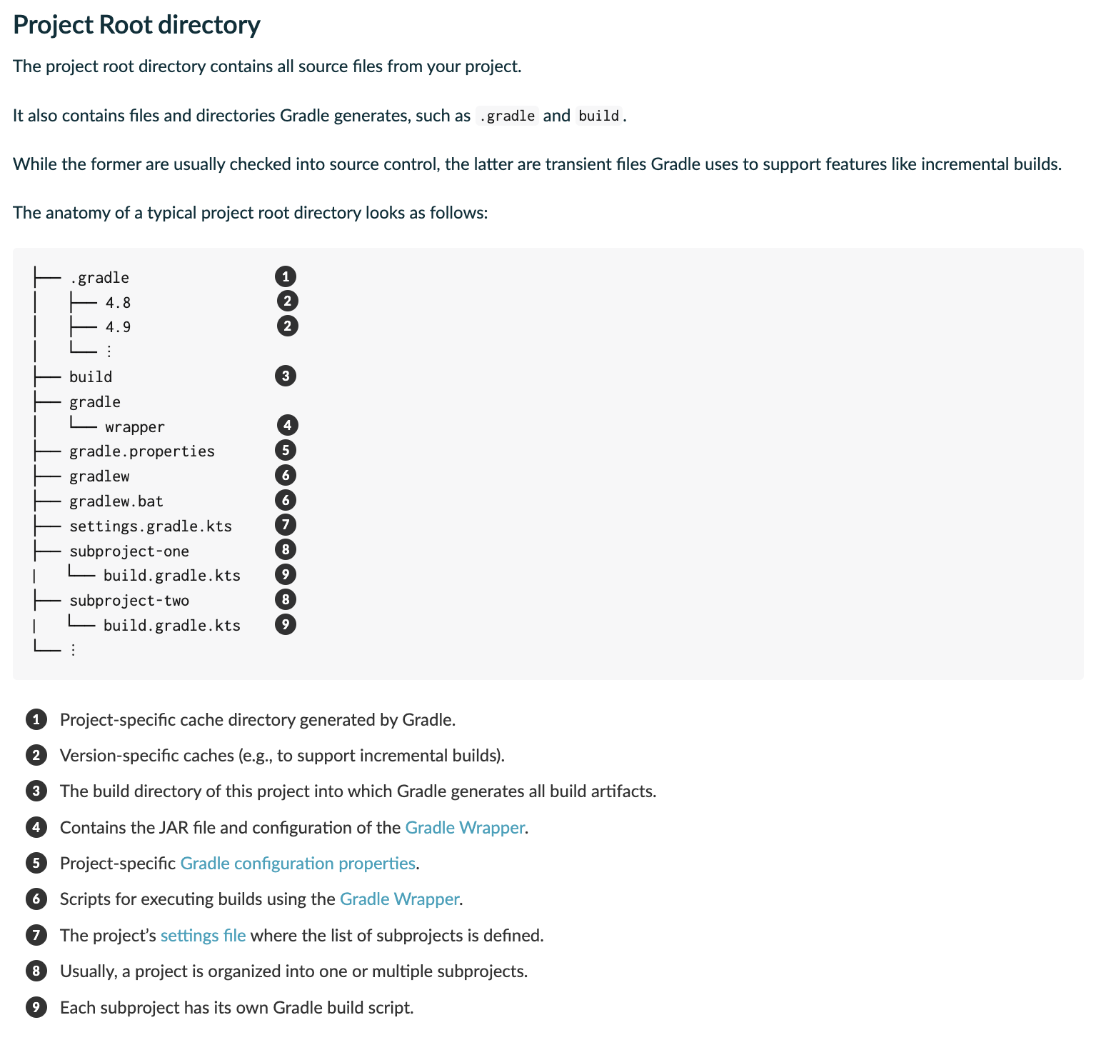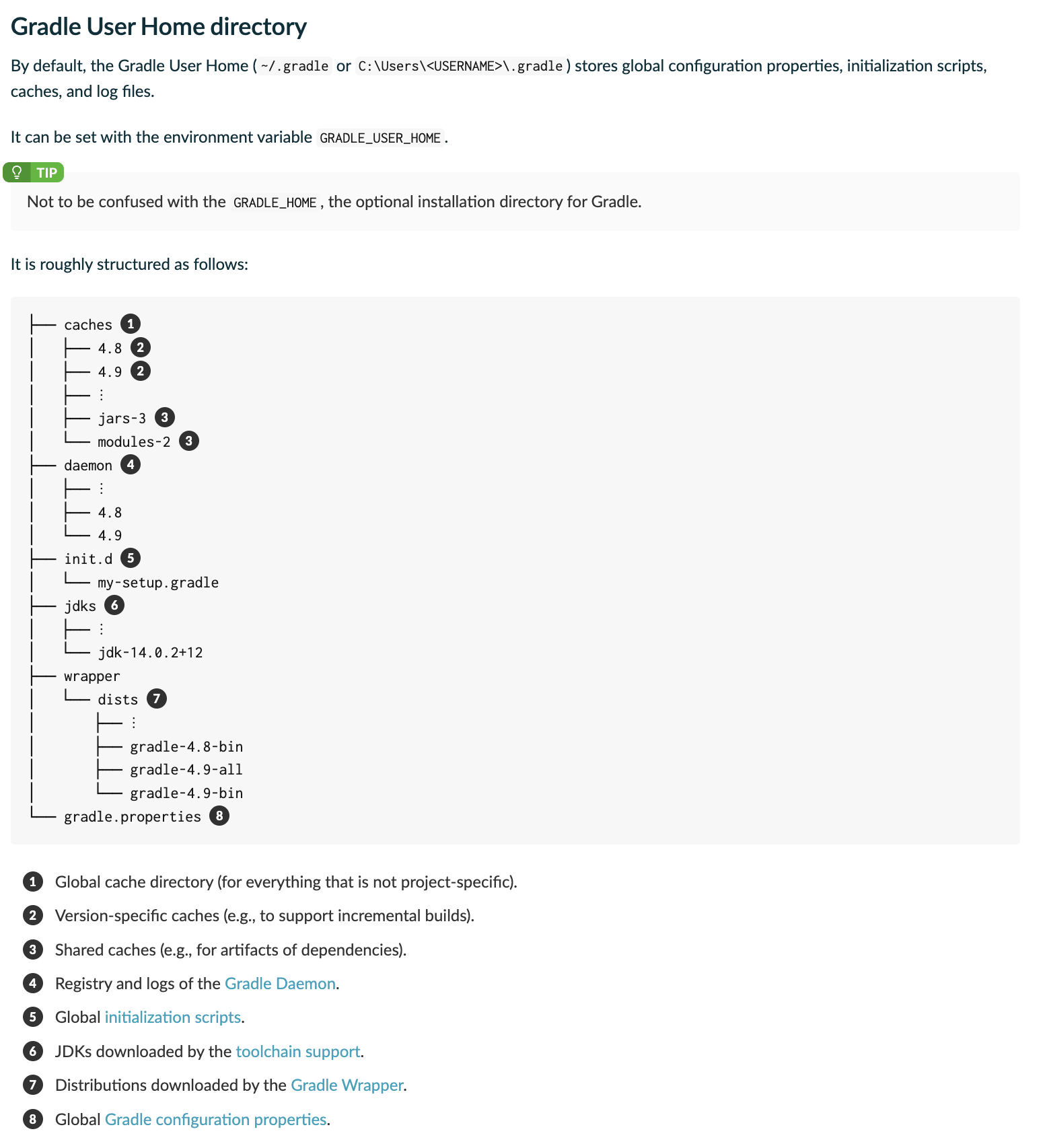 Gradle uses two main directories to perform and manage its work: the Gradle User Home directory and the Project Root directory. 参考