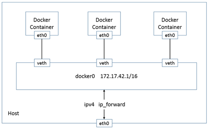 1. 容器中的eth0接口通过veth pair 连接到docker0 网桥。2. docker0网桥创建的时候会自动生成一个网络接口并附有172.17.0.1的ip,参考3. docker0 与 eth0 之间没有直接的关联,而是通过 ip_forward/ docker-proxy 等技术进行转发的。参考