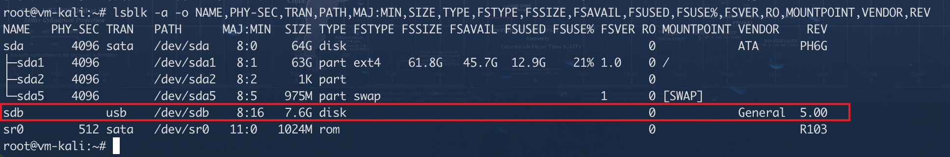输入lsblk -a -o NAME,PHY-SEC,TRAN,PATH,MAJ:MIN,SIZE,TYPE,FSTYPE,FSSIZE,FSAVAIL,FSUSED,FSUSE%,FSVER,RO,MOUNTPOINT,VENDOR,REV