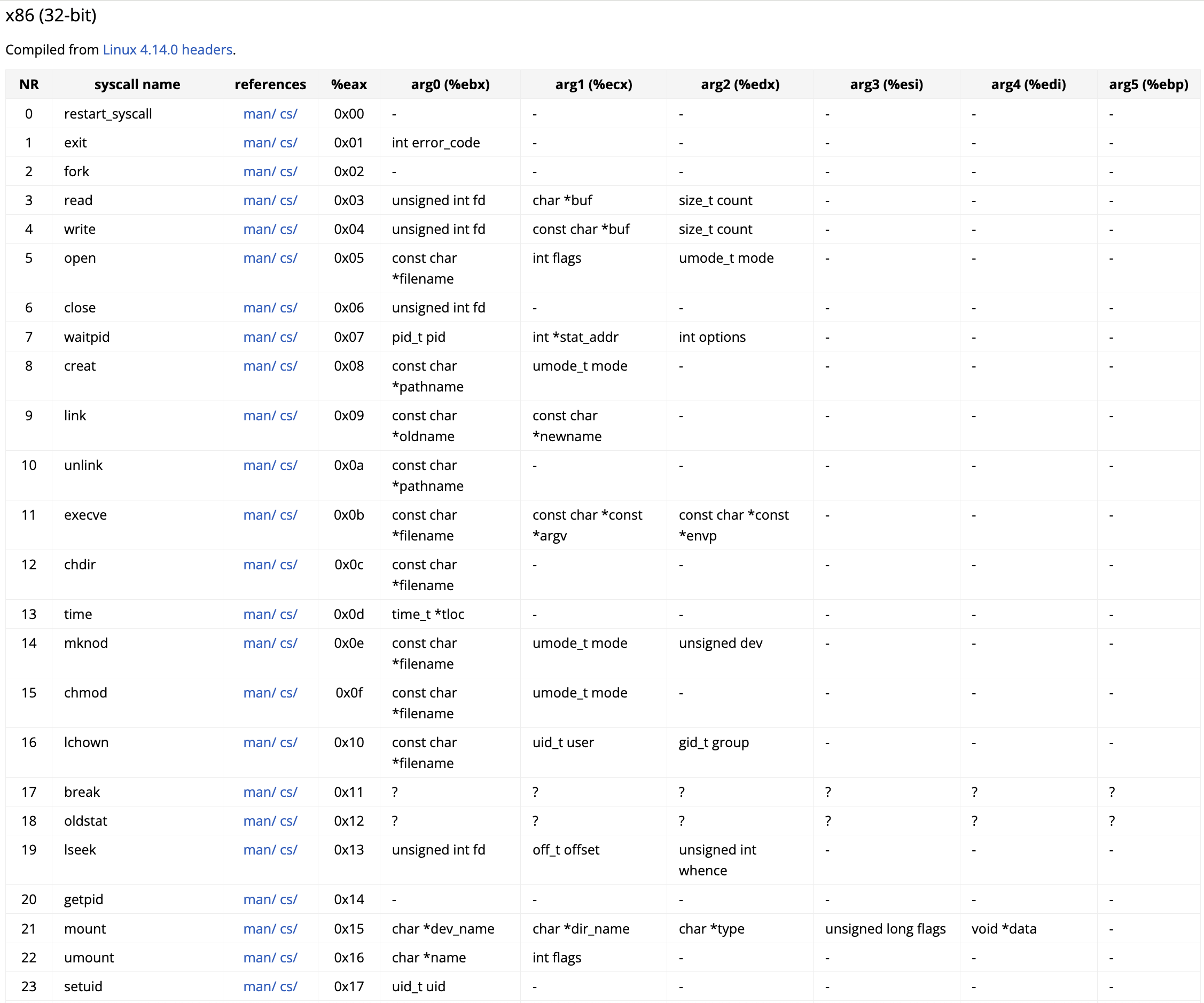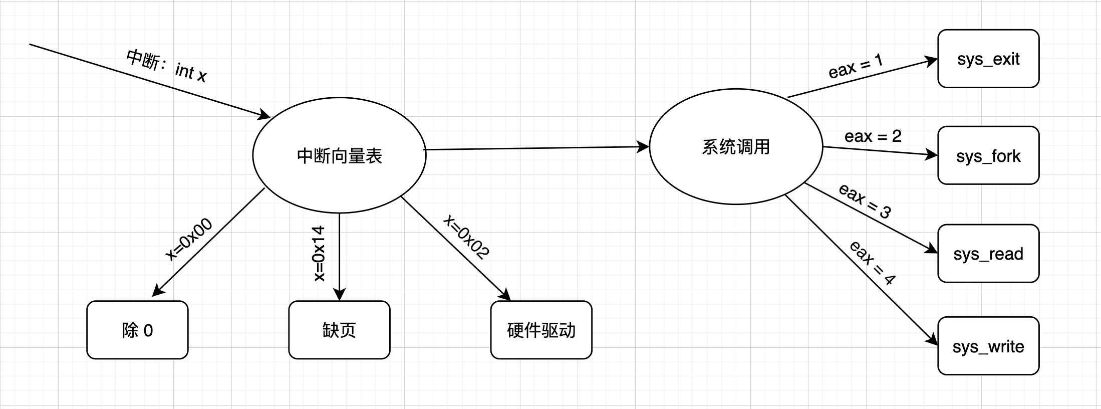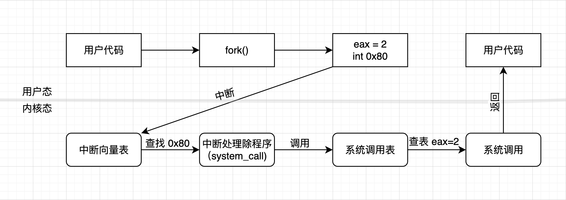 对于中断的调用,可以通过保存在 中断向量表 里面的 中断号 去调用,调用的 系统调用号(如上右图) 保存在 系统调用表 中,对于中断号,可以直接写,比如:int 0x80,系统调用号可以在触发中断前保存在 eax 寄存器里面:movl eax, 2,表示调用一个fork系统调用。其他参数传递,也是通过寄存器这种方式。所以一个调用流程图如下: