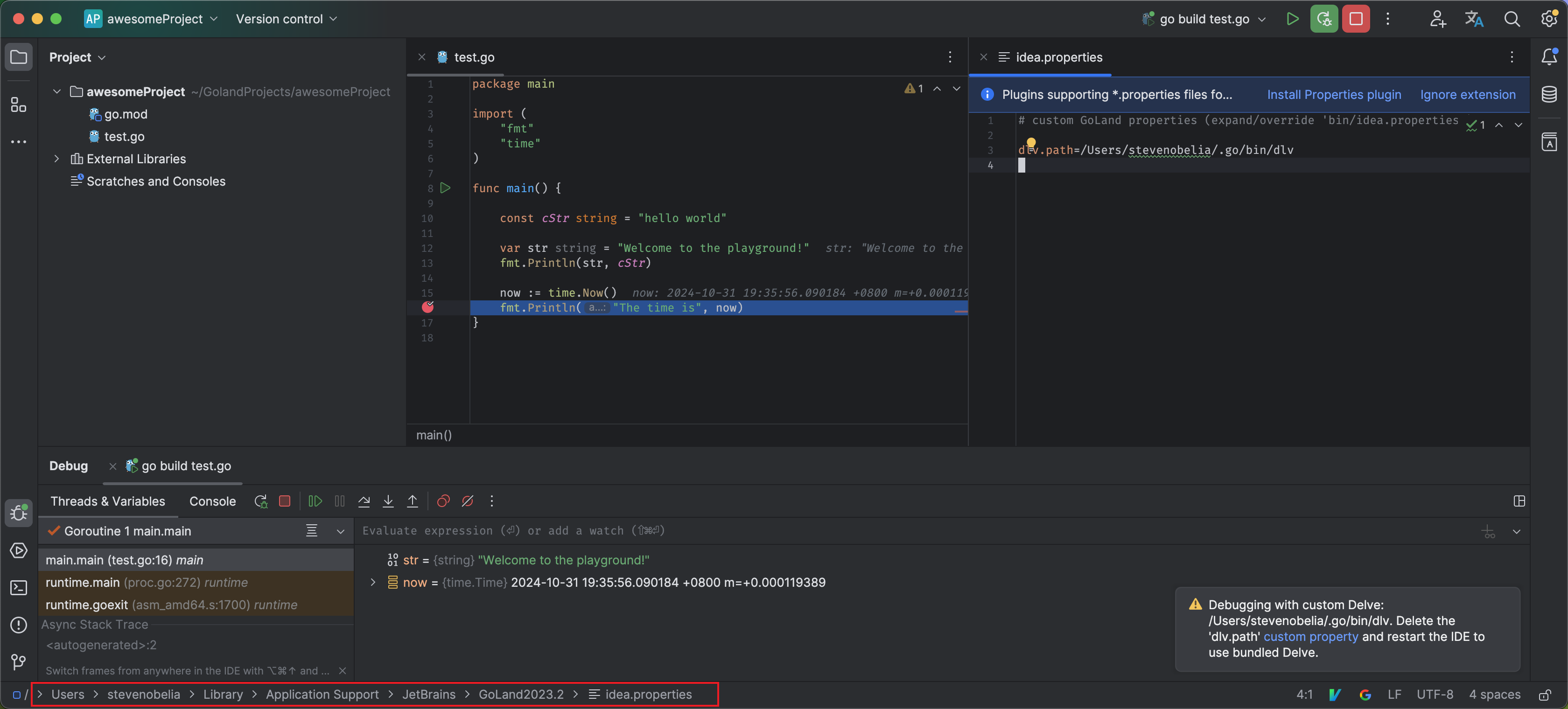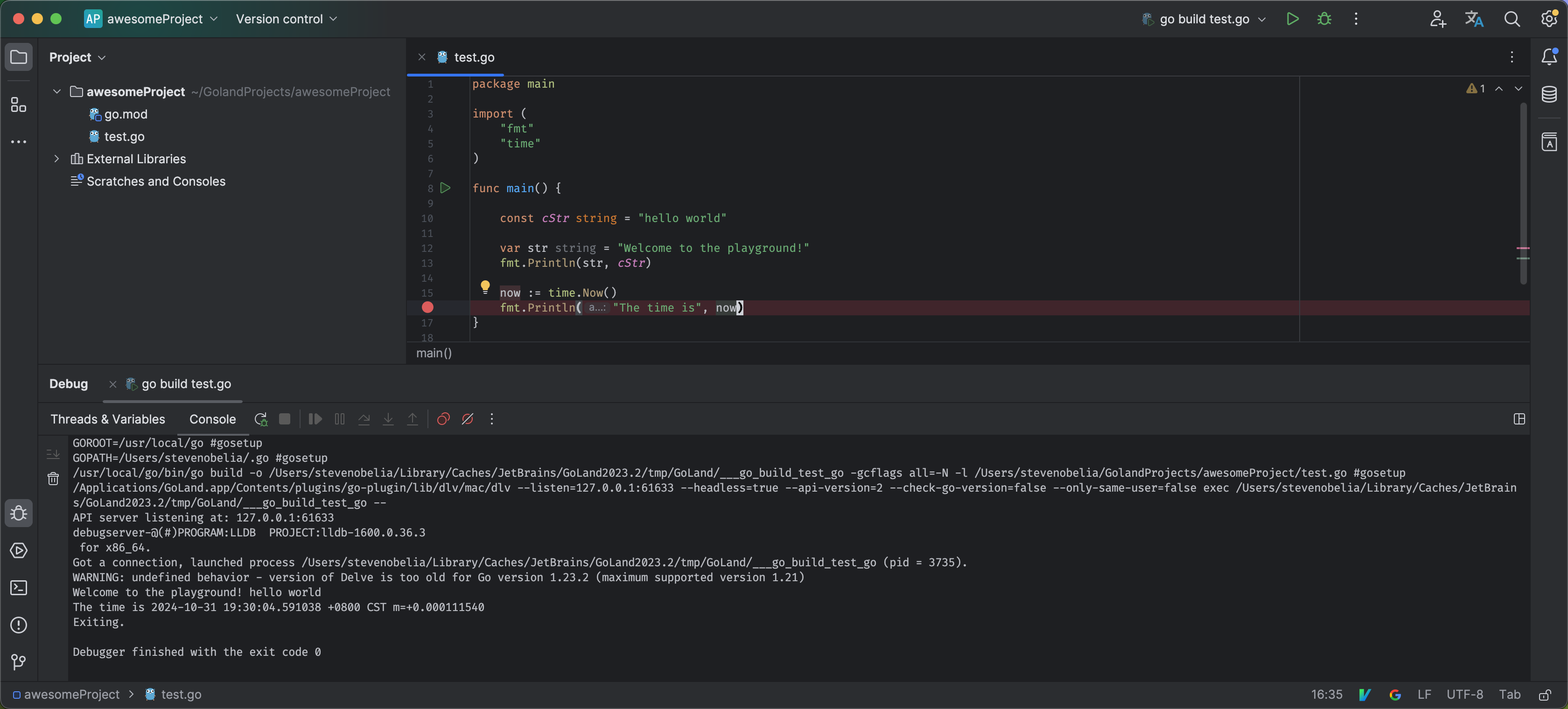 WARNING: undefined behavior - version of Delve is too old for Go version 1.23.2 (maximum supported version 1.21) 。