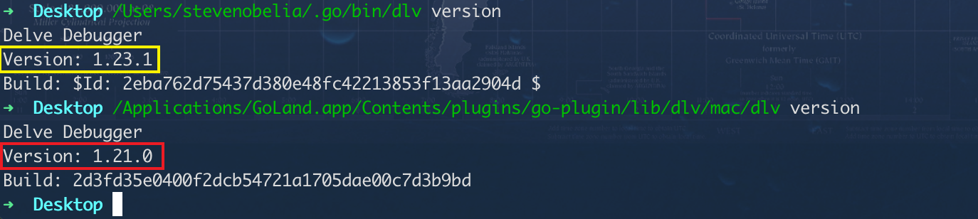 设置了GOPTAH环境变量后,dlv二进制文件会存放在$GOPATH/bin里面。/Users/stevenobelia/.go/bin/dlv version查看刚安装的 dlv 版本/Applications/GoLand.app/Contents/plugins/go-plugin/lib/dlv/mac/dlv version查看 GoLand 自带的 dlv 版本
