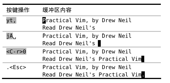 13).插入模式即使更正错误:即使在bash shell中,也可以使用。【<C-h>:删除前一个字符(同退格),<C-w>:删除前一个单词,<C-u>:删除至行首】15).不离开插入模式,粘贴寄存器中的文本。将第一行的书名粘到第二行末,光标在第一个字符。yt,jA␣<C-r>0.<Esc>