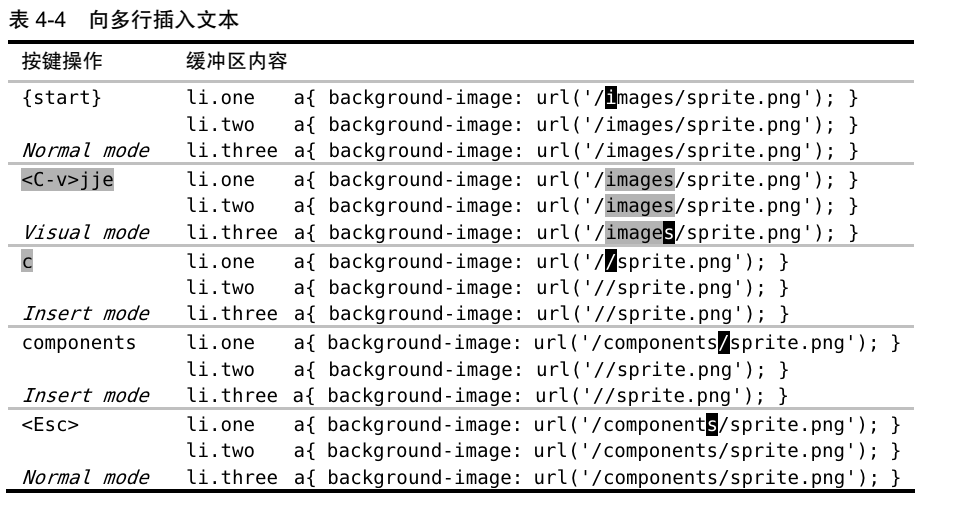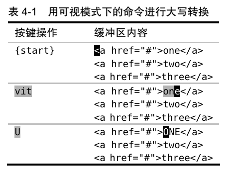 16).随时随地做运算:在插入模式中,使用<C-r>=调用表达式寄存器,输入表达式6*35<CR>做运算,将结果插入到当前光标下。17).用字符编码插入非常用字符:<C-v>u{四位十六进制 unicode}:例<C-v>u00bf-¿。查看贯标下的字符使用:ga。18).插入以二合字母{char1}{char2}表示的字符<C-k>{char}{char},例如<C-k>12-½,<C-k>?I-¿,使用命令查看二合字母:digraphs,:h digraph-table。:h digraphs-default第四章 可视模式 #
