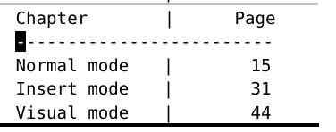 24).用面向列块的可视模式编辑表格数据: 减少列之间的间距并以竖线分割,<C-v>3jx...gvr|,添加横线yypVr-。