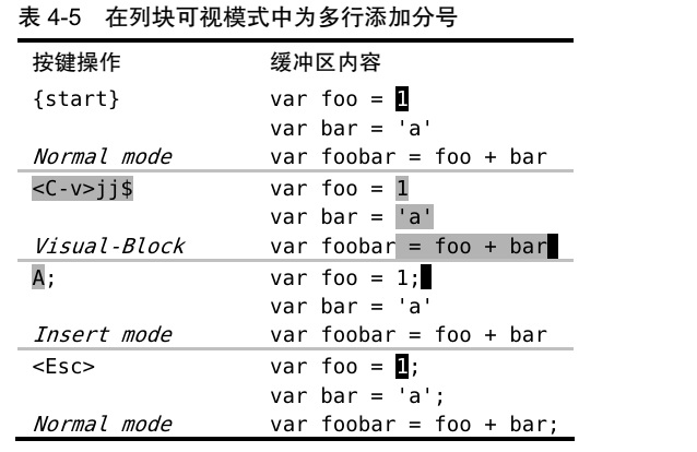 26).在长短不一的高亮块后添加文本: (可视模式中的i,a被视为文本对象的组成部分)。在每行末尾添加;:<C-v>jj$A;<Esc>