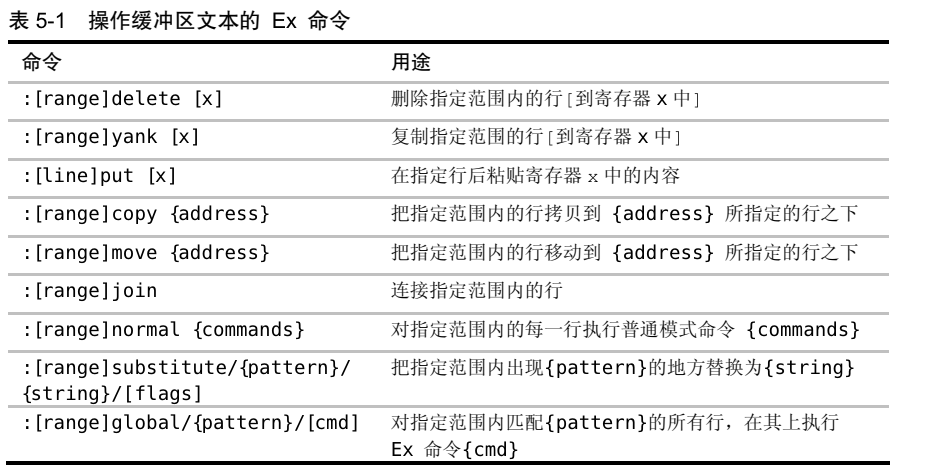 :键时,Vim 会切换到命令行模式。出于历史原因,在命令行模式中执行的命令又被称做 Ex 命令。在我们按/调出查找提示符或用<C-r>=访问表达式寄存器(参见技巧 16)时,命令行模式也会被激活。27).结识 Vim 的命令行模式: