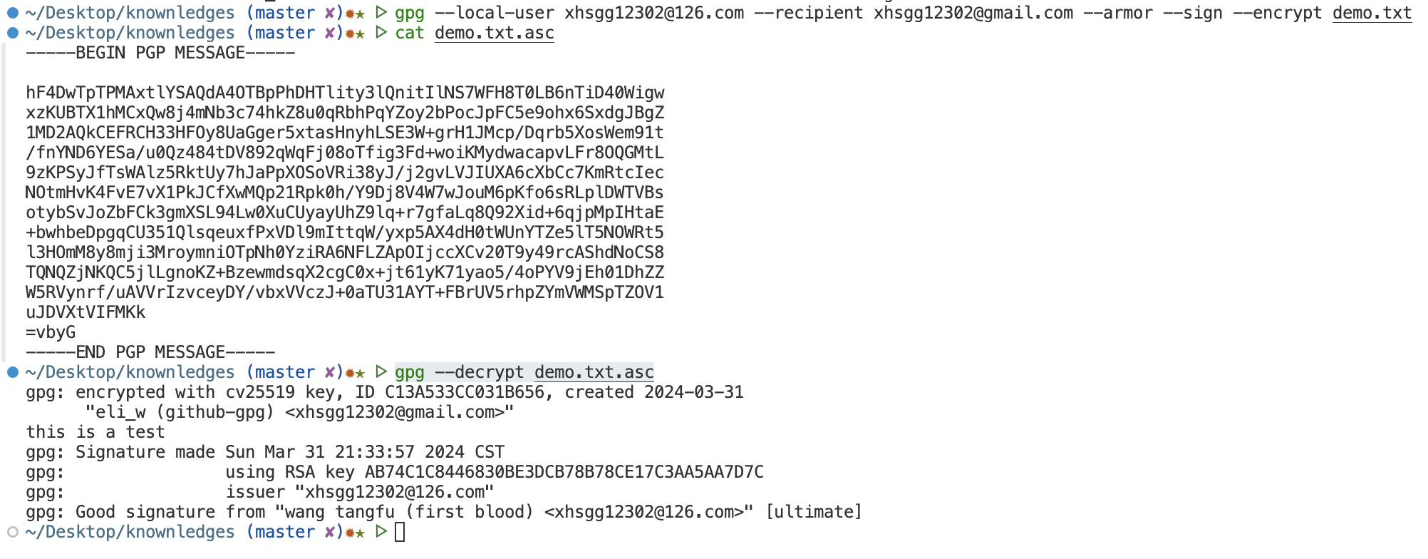 gpg --local-user [发信者KEYID] --recipient [接收者KEYID] --armor --sign --encrypt demo.txt