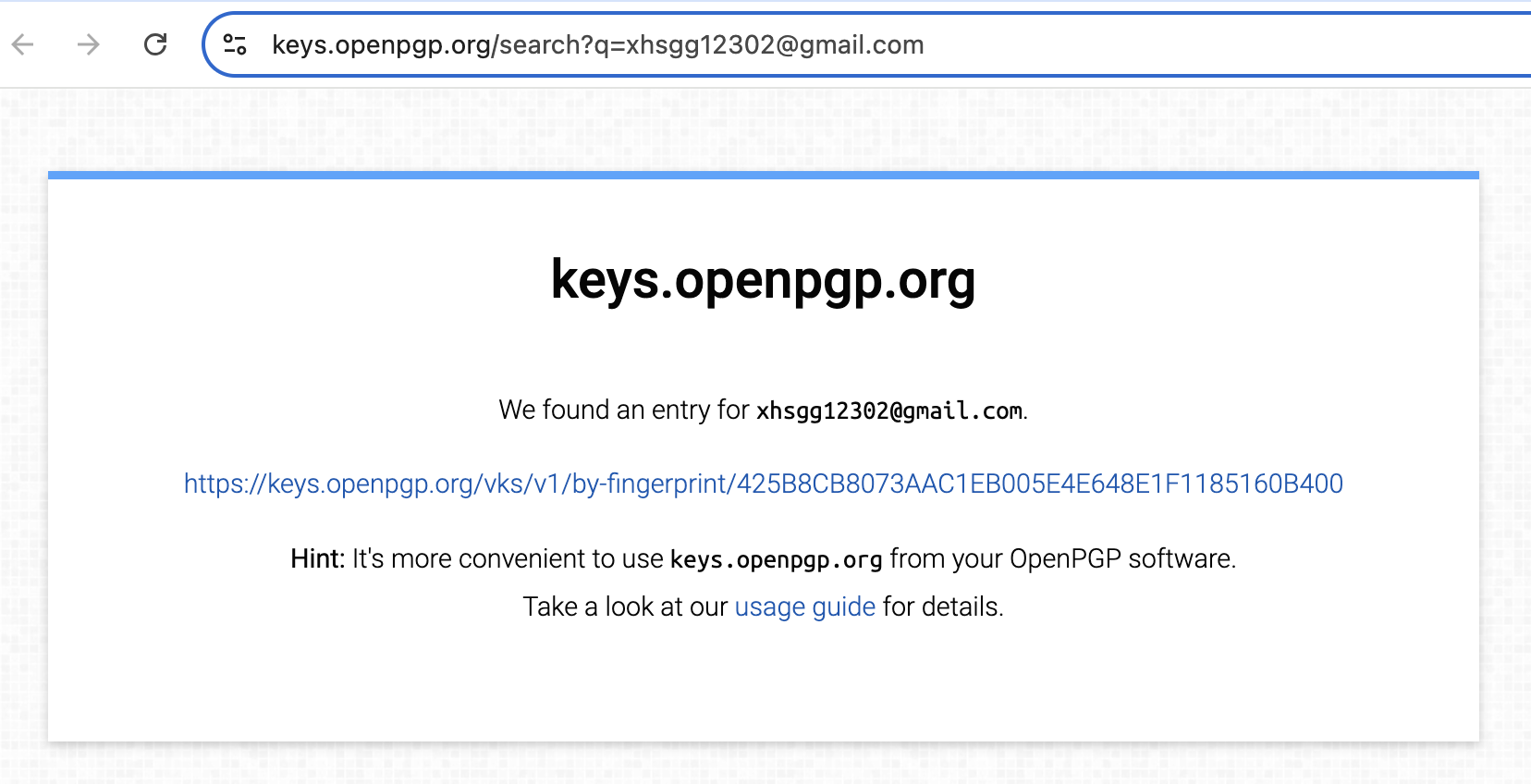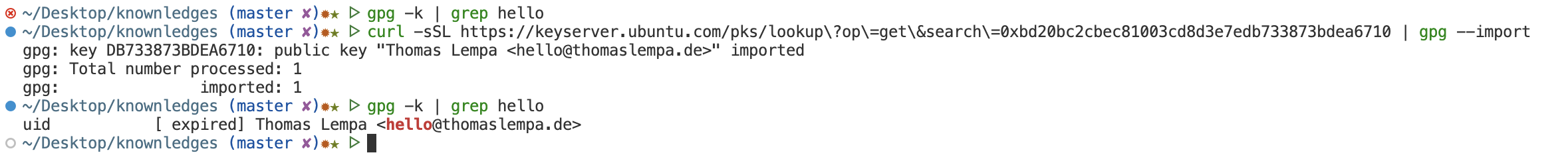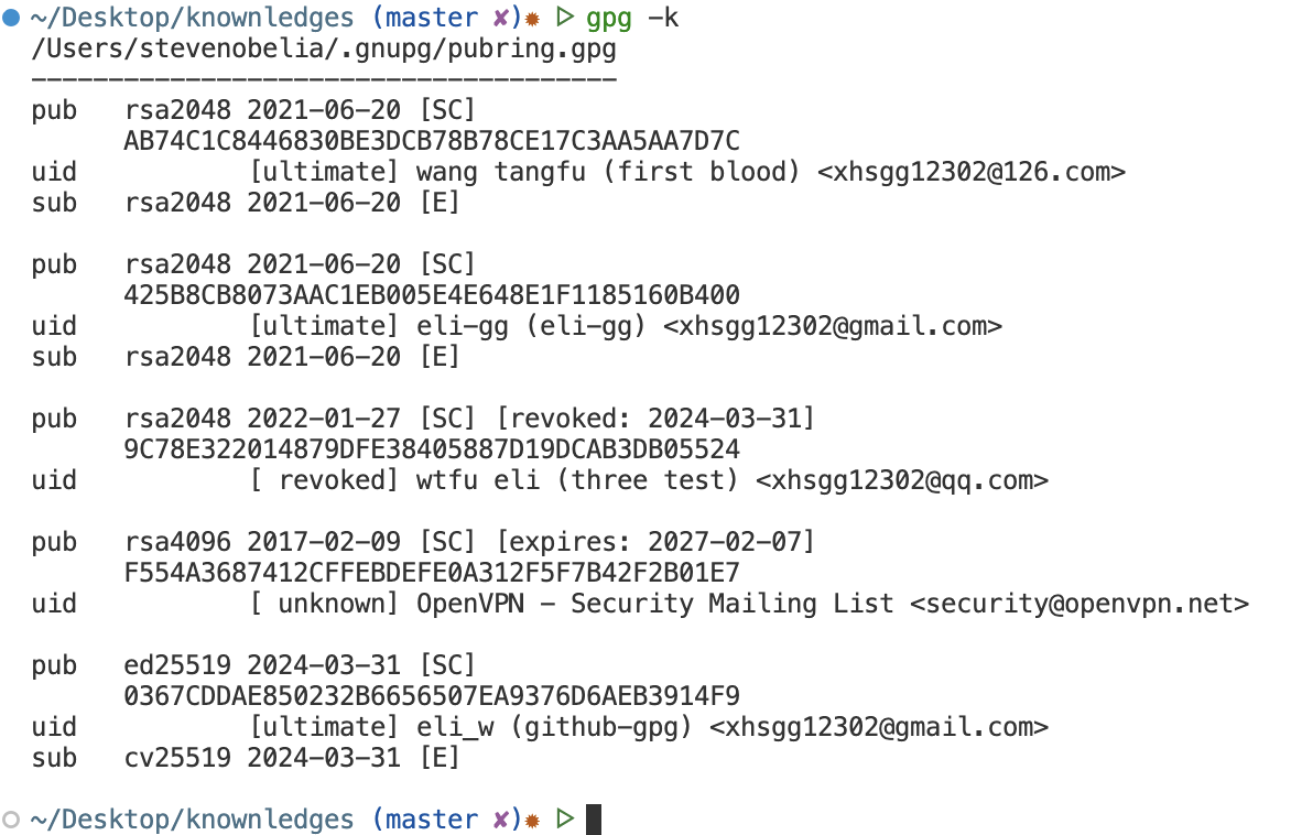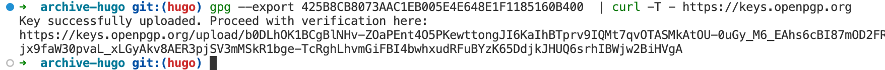 2.: 通过 curl 方式。 参考gpg --export 425B8CB8073AAC1EB005E4E648E1F1185160B400 | curl -T - https://keys.openpgp.org