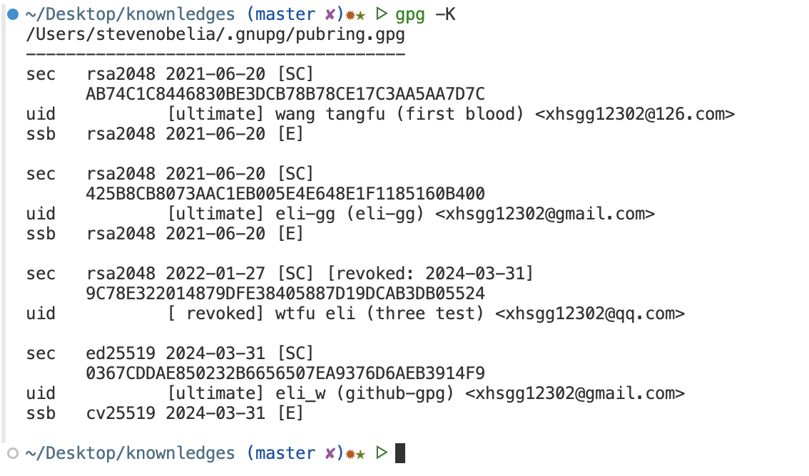 查看keygripgpg --with-keygrip -K 425B8CB8073AAC1EB005E4E648E1F1185160B400