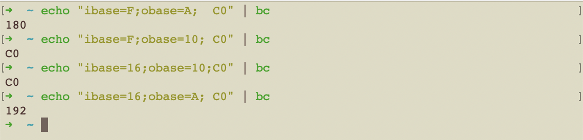 二进制-十六进制echo 'ibase=2;obase=10000; 11010111' | bc,output: D7echo 'obase=16;ibase=2; 11010111' | bc,output: D7