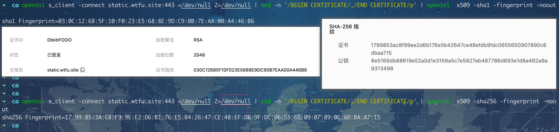 由上面信息也可以猜测到:证书的指纹 是指对当前证书所有二进制内容的算出的信息摘要。一般有 sha1,sha256 等。验证如下:获取到证书的二进制内容,然后进行哈希算出摘要。openssl s_client -connect static.wtfu.site:443 </dev/null 2>/dev/null | sed -n '/BEGIN CERTIFICATE/,/END CERTIFICATE/p' | grep -v ^- | base64 -d | sha1OPENSSL读取ssh-keygen生成公匙信息 #