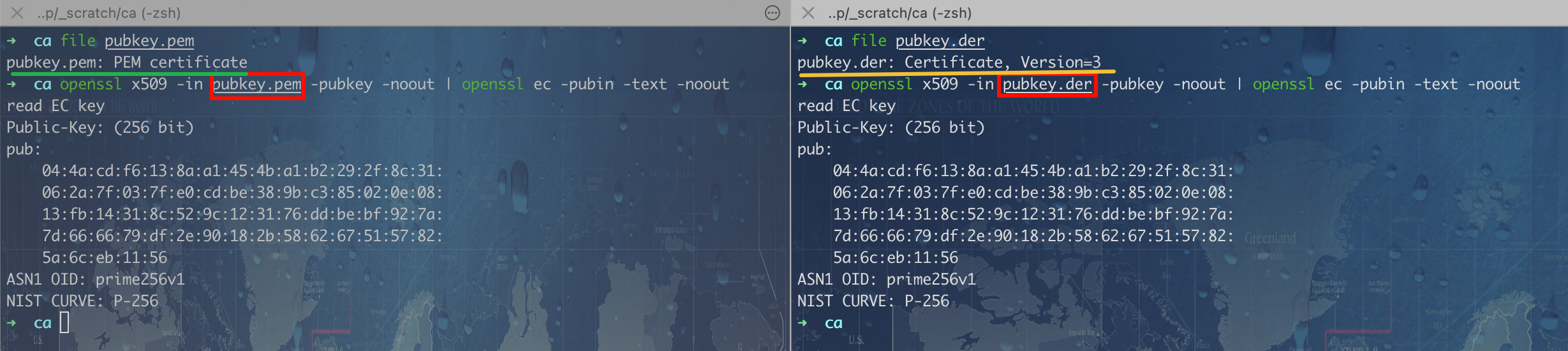 公匙:openssl x509 -in <pubkey.der | pubkey.pem> -pubkey -noout | grep -v ^- | base64 -d | shasum -a 256。Caution