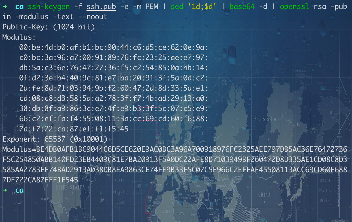1.直接使用 -e 选项导出 PEM 格式的公匙,然后去除第一,最后一行,转码后交给 openssl rsa 解析就行:ssh-keygen -f ssh.pub -e -m PEM | sed '1d;$d' | base64 -d | openssl rsa -pubin -modulus -text --noout。