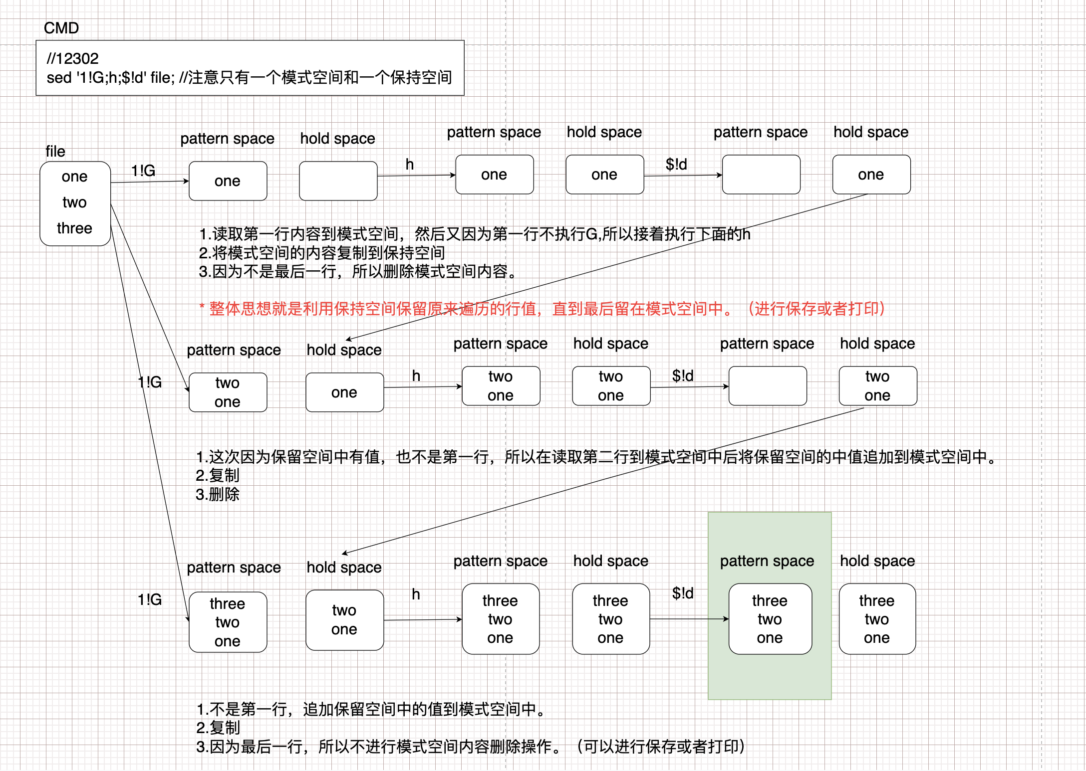 cmd func d Delete pattern space. Start next cycle. 删除pattern space的内容,开始下一个循环. h、 H Copy/append pattern space to hold space. 复制/追加pattern space的内容到hold space. g、 G Copy/append hold space to pattern space. 复制/追加hold space的内容到pattern space. x Exchange the contents of the hold and pattern spaces. 交换hold space和pattern space的内容. 操作 #