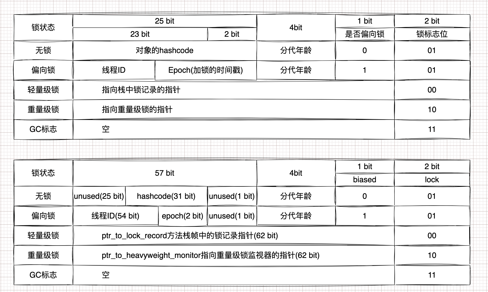 GC标志位、哈希码、锁状态等信息。Mark Word 的位长度为 JVM 的一个 Word 大小,也就是说 32 位 JVM 的 Mark word 为 32 位,64 位 JVM 为 64 位。Mark Word 的位长度不会受到 Oop 对象指针压缩选项的影响。结构信息: