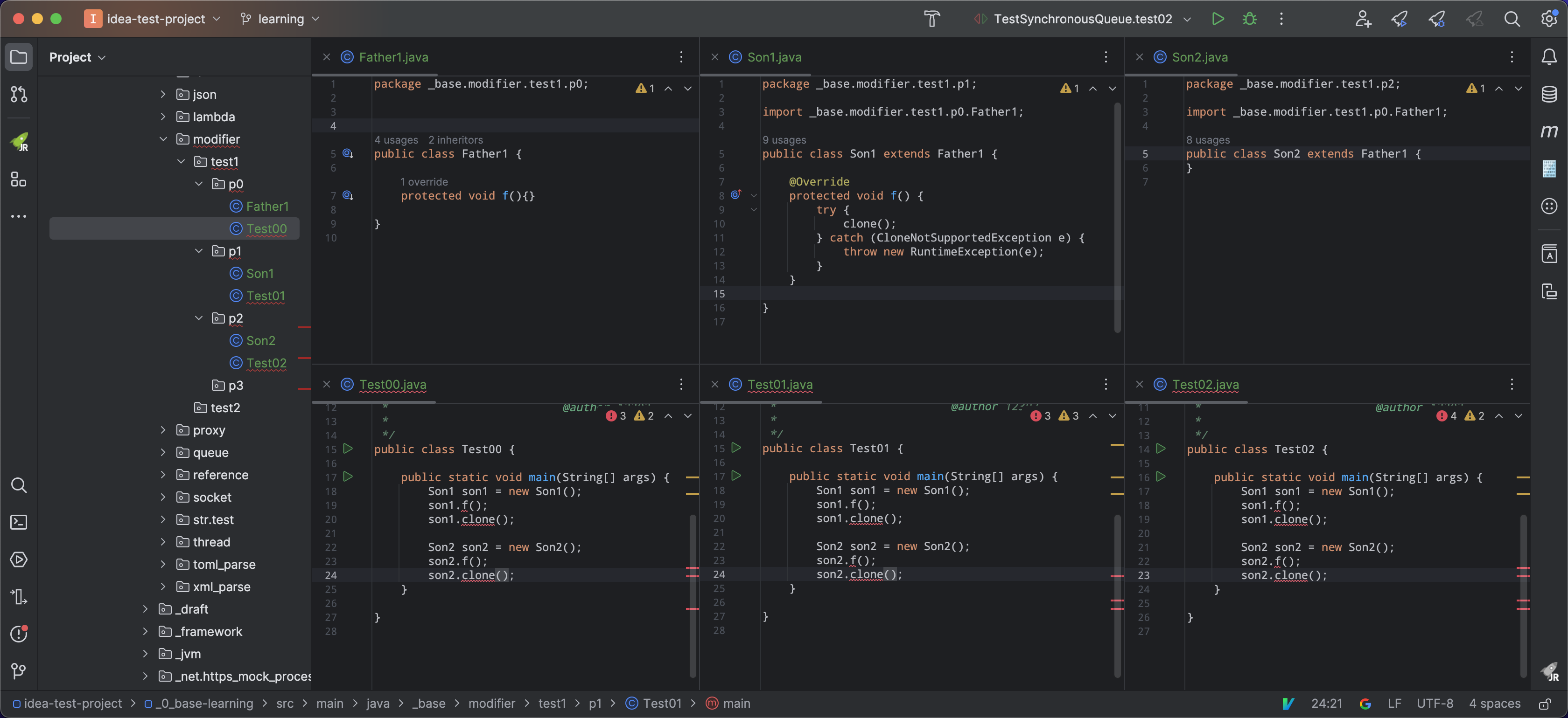 例如 case01#Test00#son2.f() 其中 son2.f() 方法继承自 Father1,定义在 p0 中。