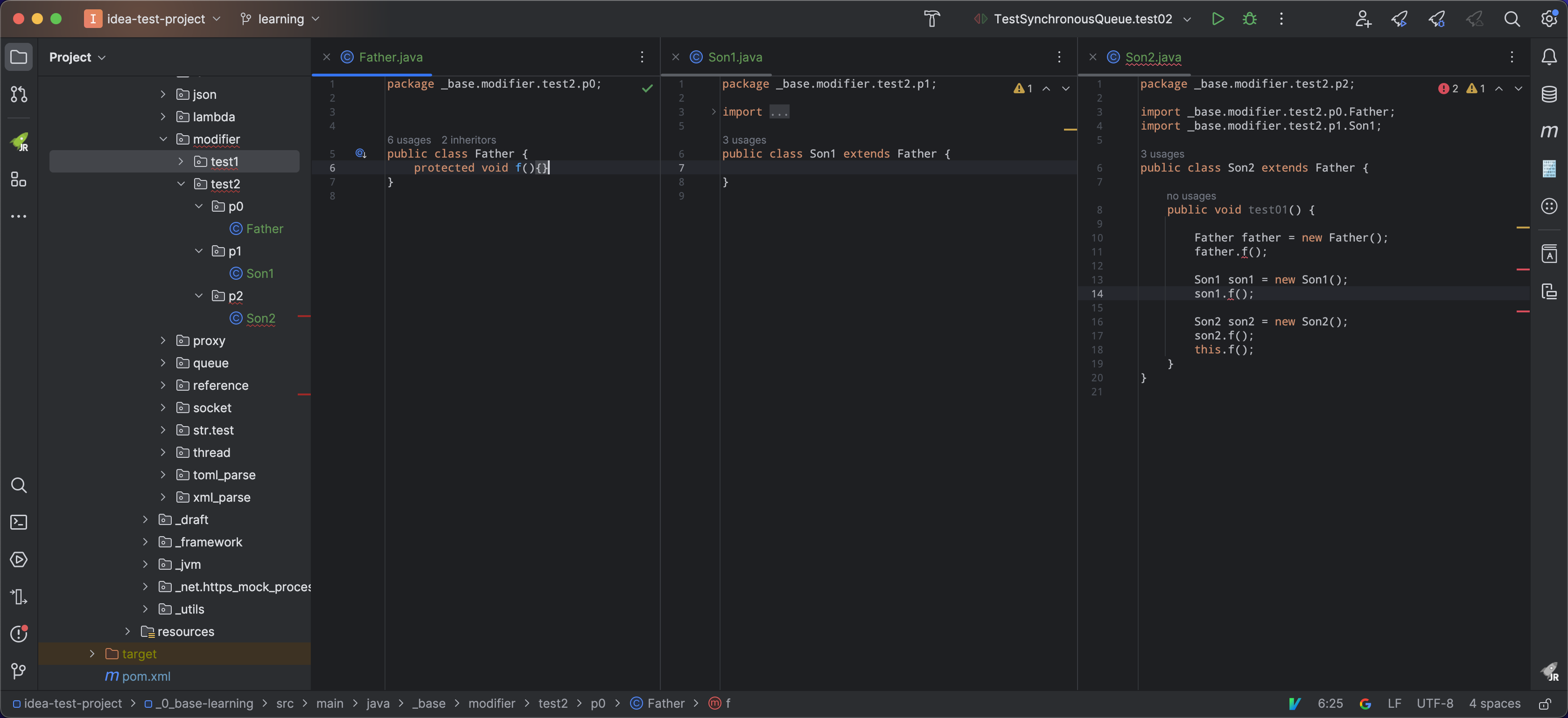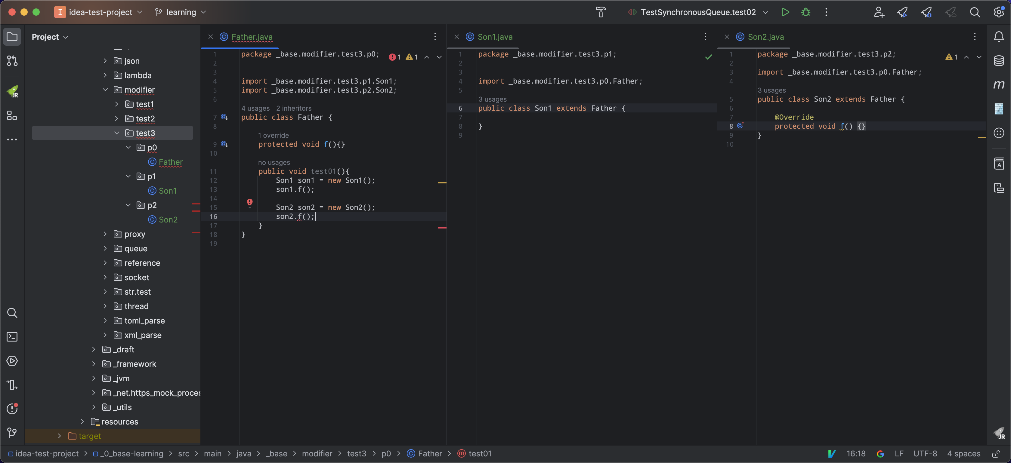 例如 case03#Father#test01() Son1 中的 f() 在 同包 p0 中,而 Son2 中的方法 f() 在 p2 中b).在子类中