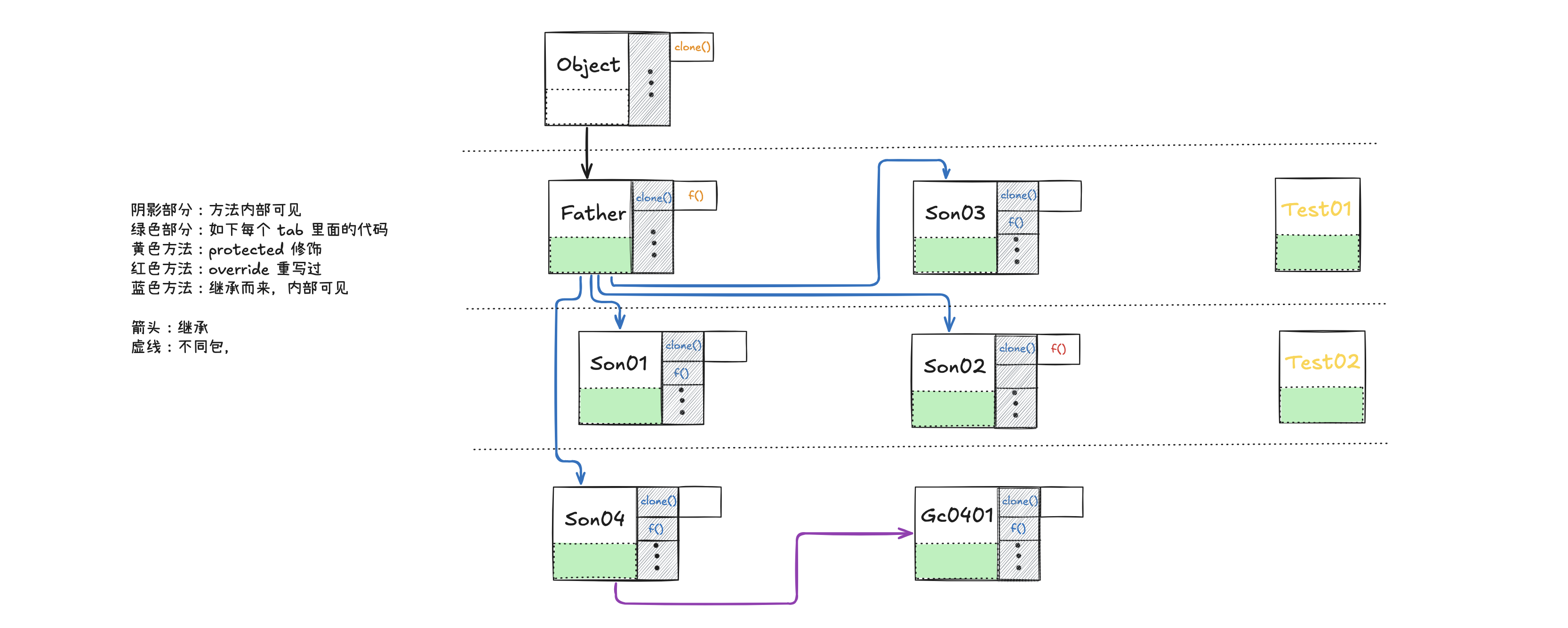 继承可以理解为将 protected 方法的可见性传递到子类中。比如 case02 中son2.f()、this.f()可以访问。a).在同包中