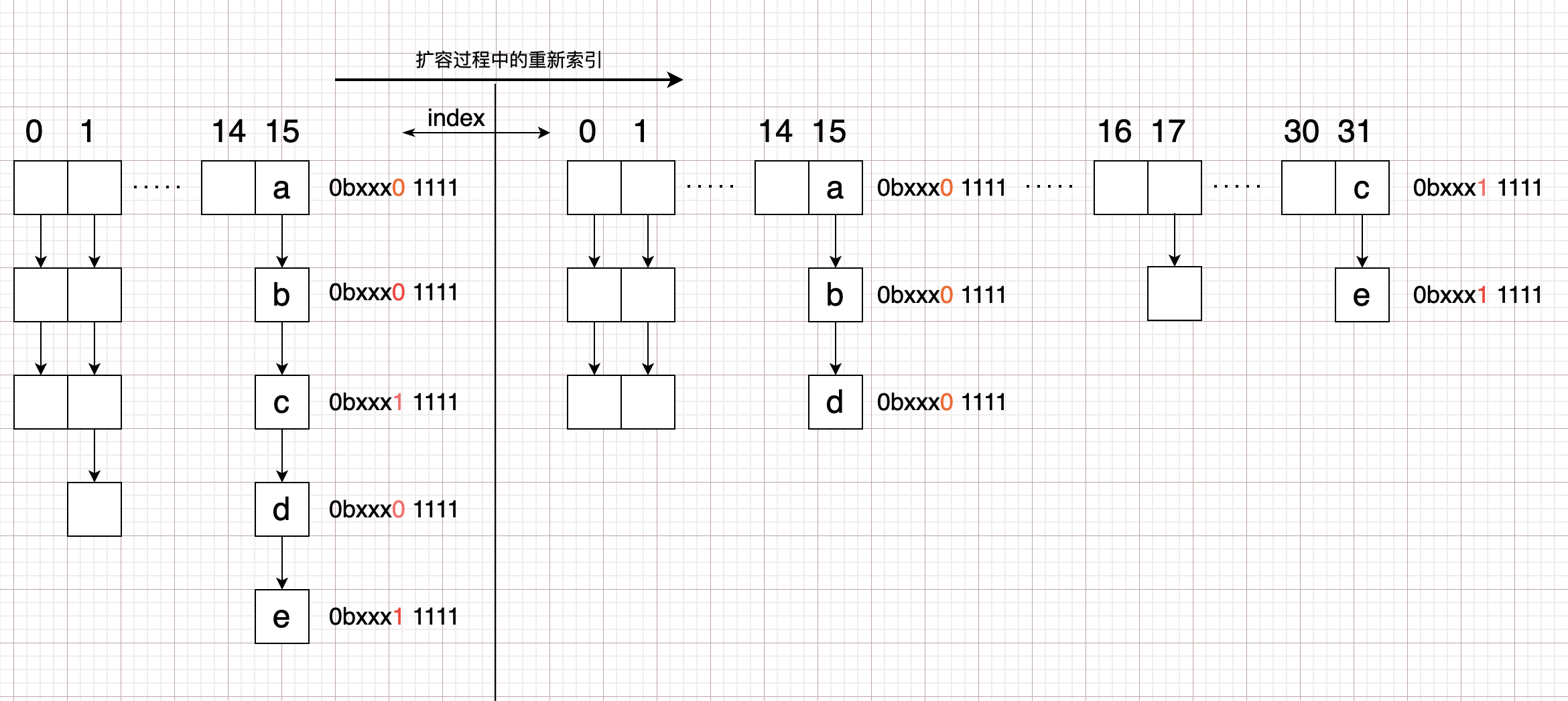 若将a,b,c,d,e这些原在15位置上的hash值由原来的 \(16=2^4\) 重新分配到新数组 \(32=2^5\) 的时候,决定新下标的与值为11111。也就是原来15上面的0bxxx01111,还在15上(因为0bxxx01111 & 11111 = 15),而0bxxx11111,就分配在31了(因为0bxxx11111 & 11111 = 31)。