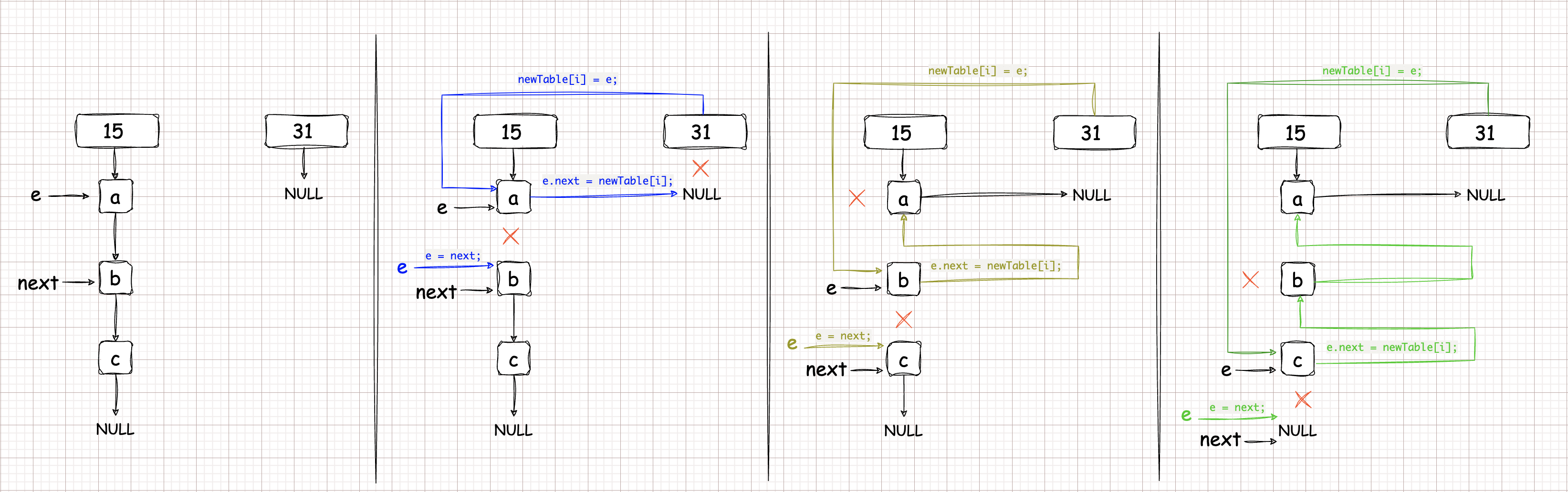 如果index=15的位置上只有一个节点a,则hash值肯定为0bxxxx1111。假设有其他节点会重新分配到新数组的话。则其他节点的hash后四位一定为1111。此时会存在矛盾,因为如果其他节点的hash后四位为1111的话,则原来一定存在15的位置上,不可能只有a元素一个。所以不用担心直接覆盖的情况,因为就只有一个。