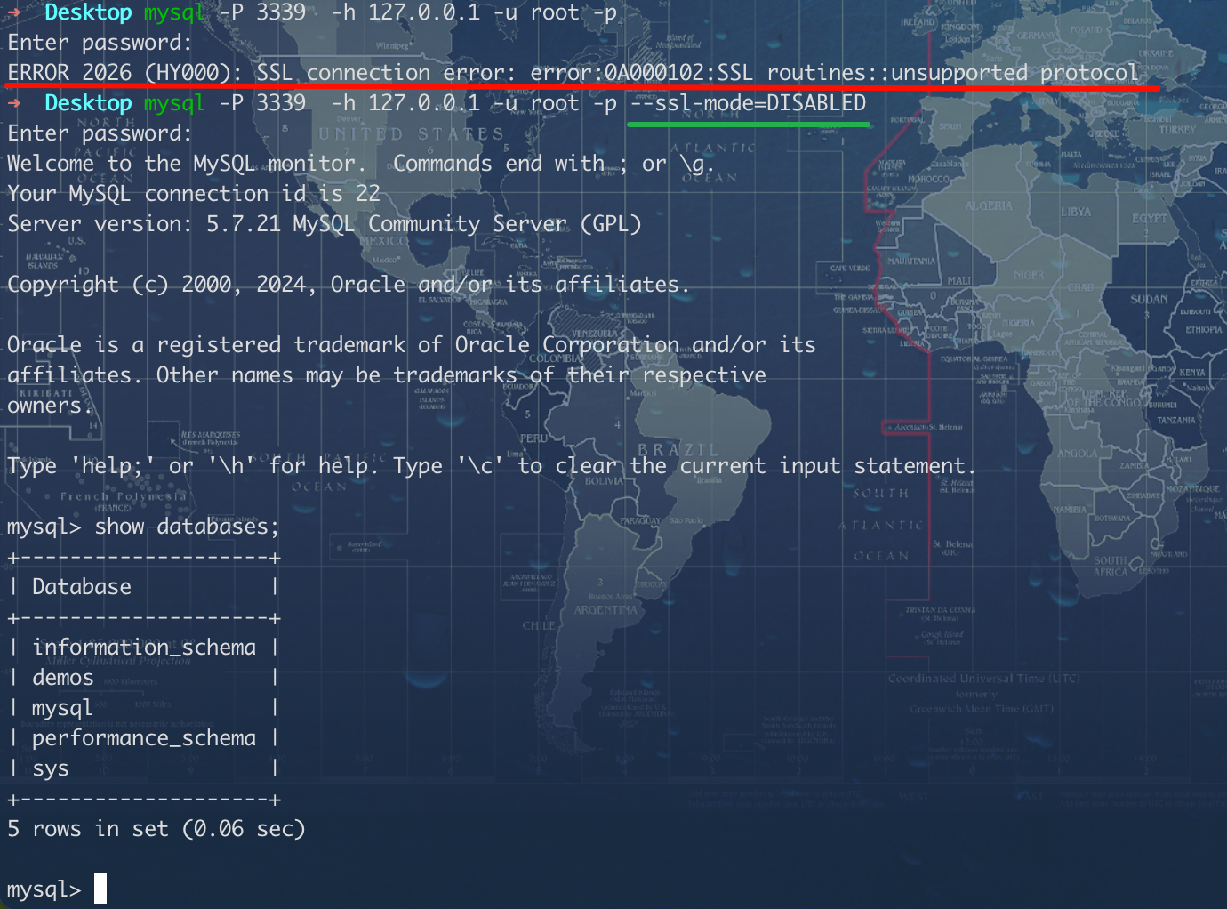 mysql 本地客户端连接 docker 内部报错ERROR 2026 (HY000): SSL connection error: error:0A000102:SSL routines::unsupported protocol