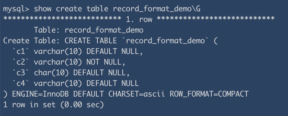 CREATE TABLE variables_length_demo ( c1 VARCHAR(300), c2 VARCHAR(10) ) CHARSET=ascii ROW_FORMAT=COMPACT;
