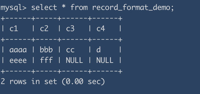 CREATE TABLE 表名 (列的信息) ROW_FORMAT=行格式名称ALTER TABLE 表名 ROW_FORMAT=行格式名称现在表中的记录就是这个样子的: