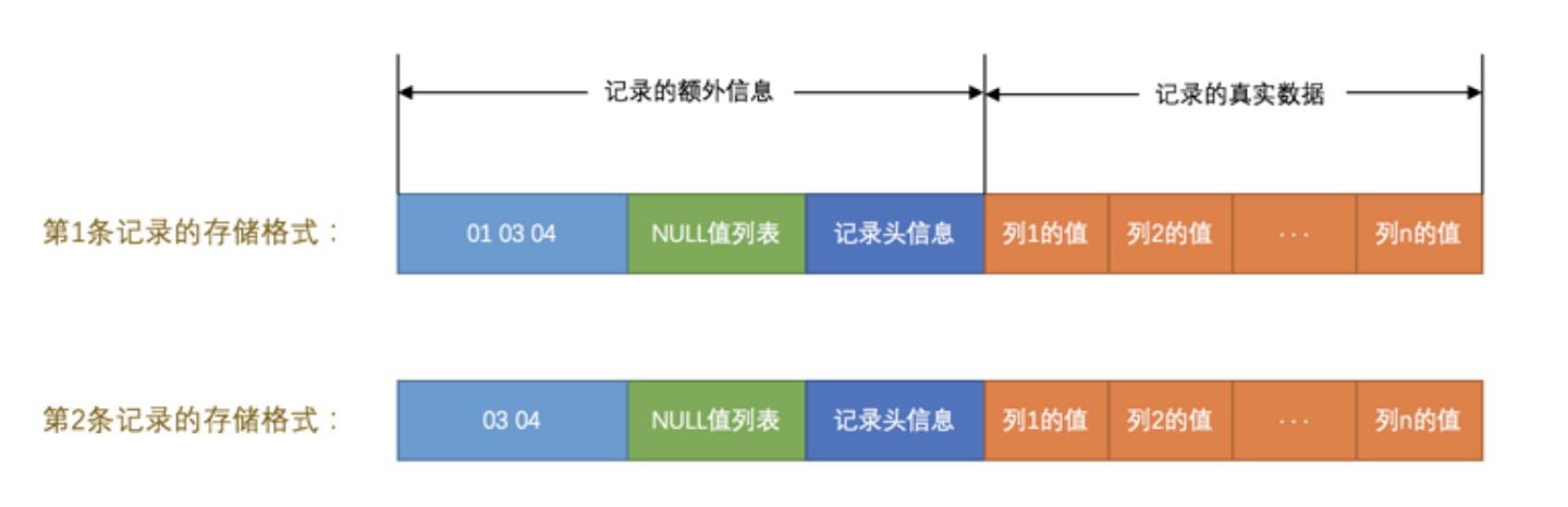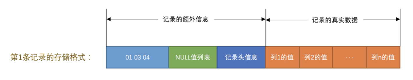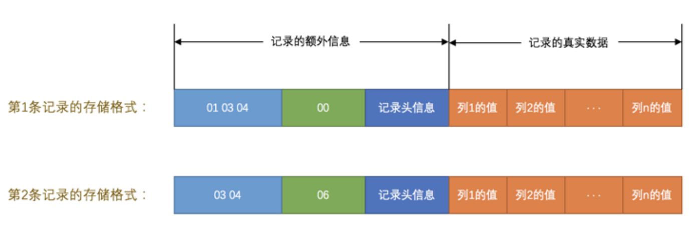 大家从图中可以看出来,一条完整的记录其实可以被分为 记录的额外信息 和 记录的真实数据 两大部分,下边我们详细看一下这两部分的组成。
