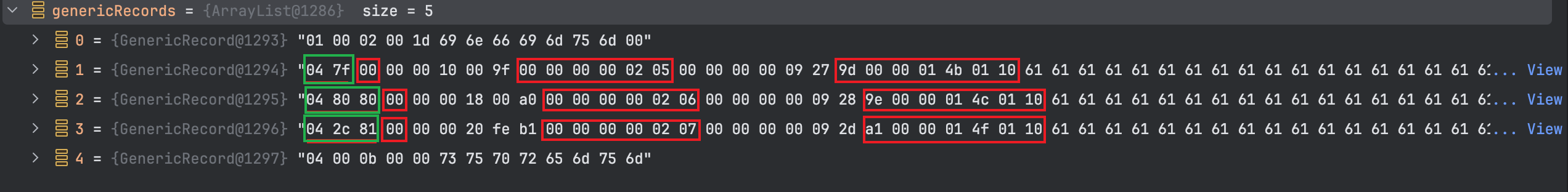 - 表 record_format_demo 使用的是 ascii 字符集,所以 0x61616161 就表示字符串 ‘aaaa’ , 0x626262 就表示字符串 ‘bbb’ ,以此类推。