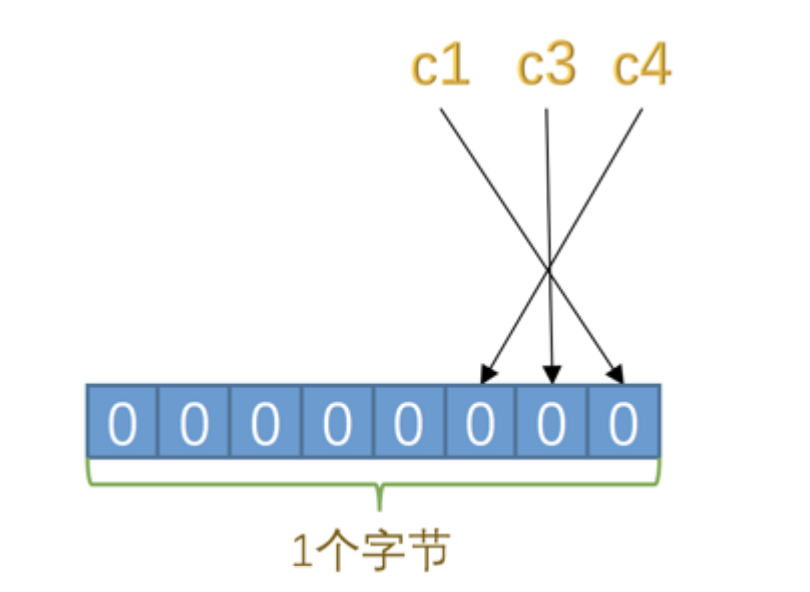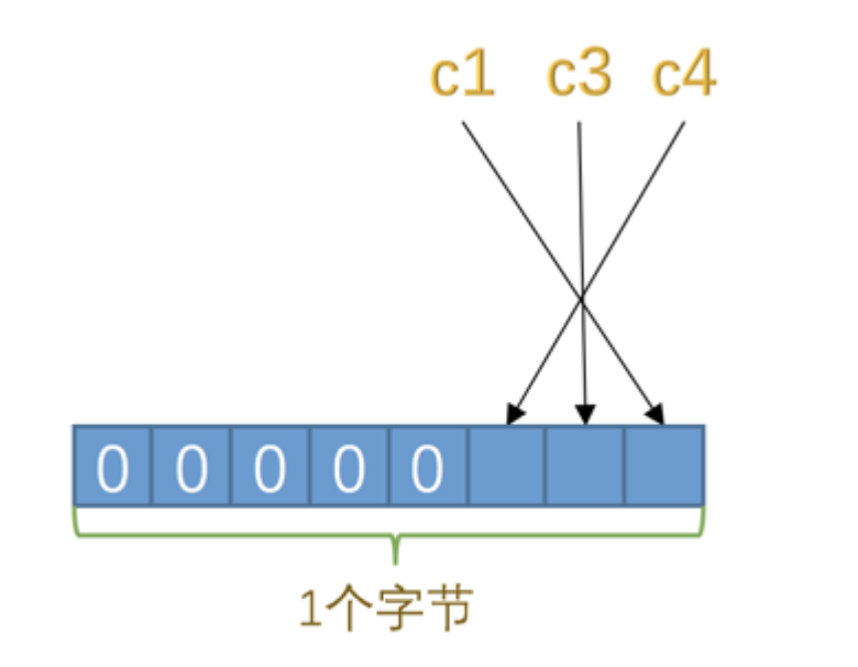 - 对于第一条记录来说, c1 、 c3 、 c4 这3个列的值都不为 NULL ,所以它们对应的二进制位都是 0 ,画个图就是这样: