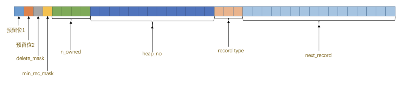 名称 大小(单位:bit) 描述 预留位1 1 没有使用 预留位2 1 没有使用 delete_mask 1 标记该记录是否被删除 min_rec_mask 1 B+树的每层非叶子节点中的最小记录都会添加该标记 n_owned 4 表示当前记录拥有的记录数 heap_no 13 表示当前记录在记录堆的位置信息 record_type 3 表示当前记录的类型, 0 表示普通记录, 1 表示B+树非叶子节点记录(目录项/页记录), 2 表示最小记录, 3表示最大记录 next_record 16 表示下一条记录的相对位置 大家不要被这么多的属性和陌生的概念给吓着,我这里只是为了内容的完整性把这些位代表的意思都写了出来,现在没必要把它们的意思都记住,记住也没啥用,现在只需要看一遍混个脸熟,等之后用到这些属性的时候我们再回过头来看。