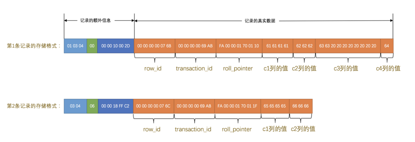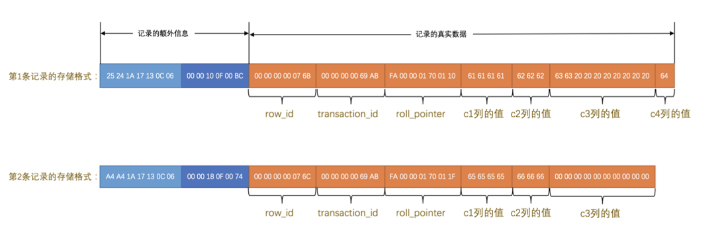 因为表 record_format_demo 并没有定义主键,所以 MySQL 服务器会为每条记录增加上述的3个列。现在看一下加上 记录的真实数据 的两个记录长什么样吧: