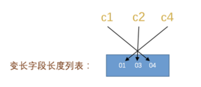 record_format_demo 表的 c1 、 c2 、 c4 列的类型是 VARCHAR(10) ,而 c3 列的类型是 CHAR(10) ,我们说在Compact 行格式下只会把变长类型的列的长度逆序存到 变长字段长度列表 中,就像这样: