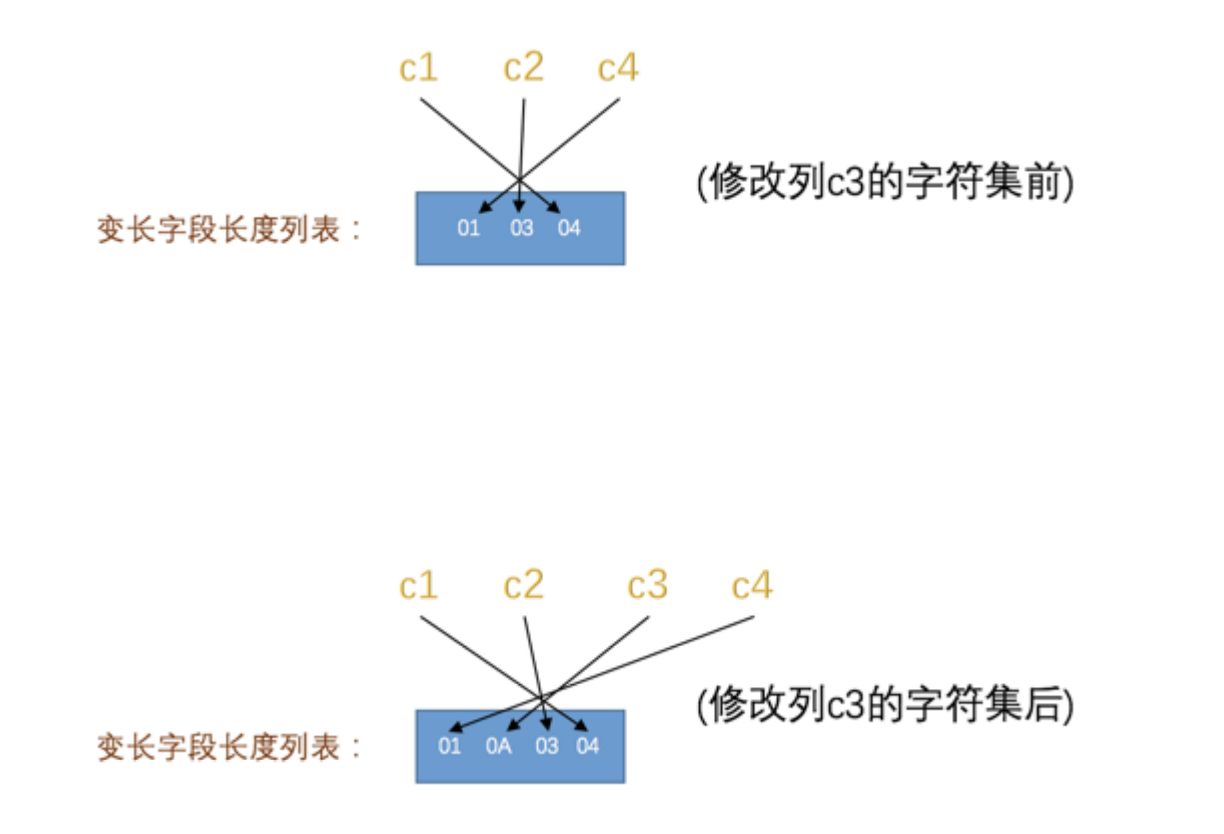 修改该列字符集后记录的 变长字段长度列表 也发生了变化,如图: