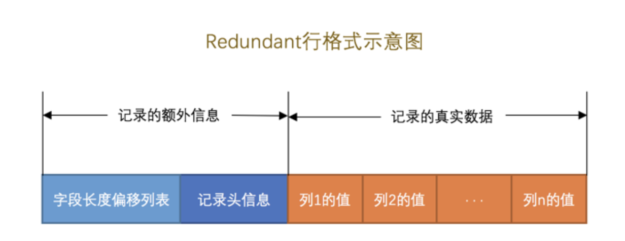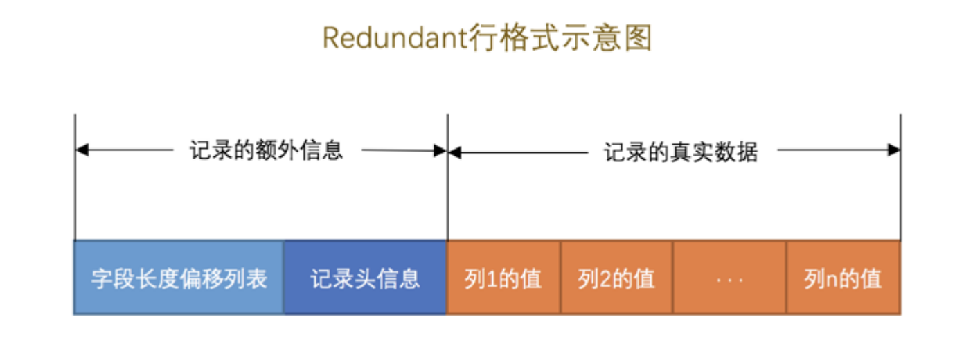 其实知道了 Compact 行格式之后,其他的行格式就是依葫芦画瓢了。我们现在要介绍的 Redundant 行格式是MySQL5.0 之前用的一种行格式,也就是说它已经非常老了,但是本着知识完整性的角度还是要提一下,大家乐呵乐呵的看就好。画个图展示一下 Redundant 行格式的全貌: