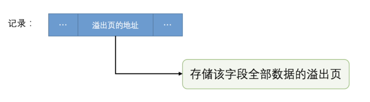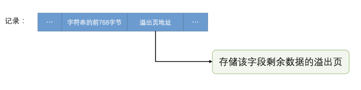 从图中可以看出来,对于 Compact 和 Reduntant 行格式来说,如果某一列中的数据非常多的话,在本记录的真实数据处只会存储该列的前 768 个字节的数据和一个指向其他页的地址,然后把剩下的数据存放到其他页中,这个过程也叫做 行溢出 ,存储超出 768 字节的那些页面也被称为 溢出页 。画一个简图就是这样: