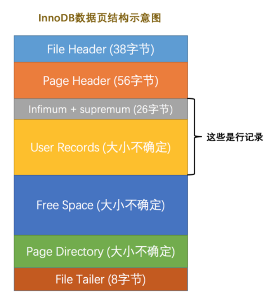 数据页代表的这块 16KB 大小的存储空间可以被划分为多个部分,不同部分有不同的功能,各个部分如图所示: