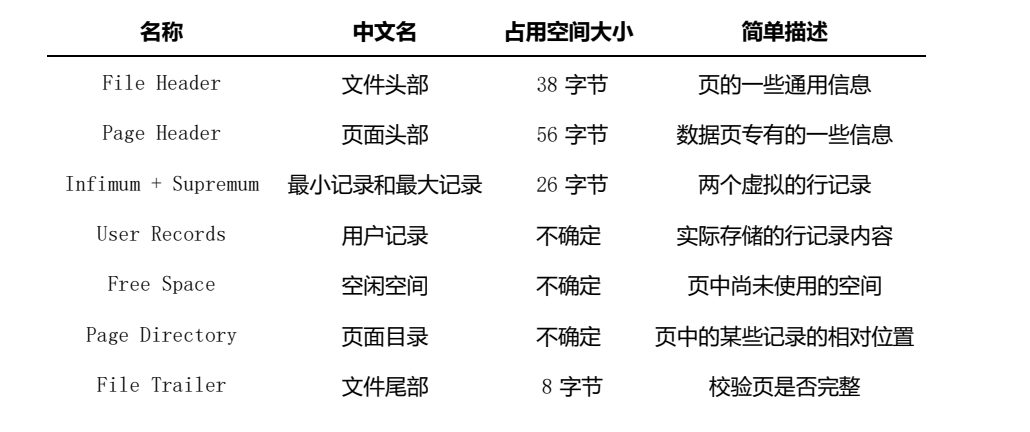 从图中可以看出,一个 InnoDB 数据页的存储空间大致被划分成了 7 个部分,有的部分占用的字节数是确定的,有的部分占用的字节数是不确定的。下边我们用表格的方式来大致描述一下这7个部分都存储一些啥内容(快速的瞅一眼就行了,后边会详细唠叨的):
