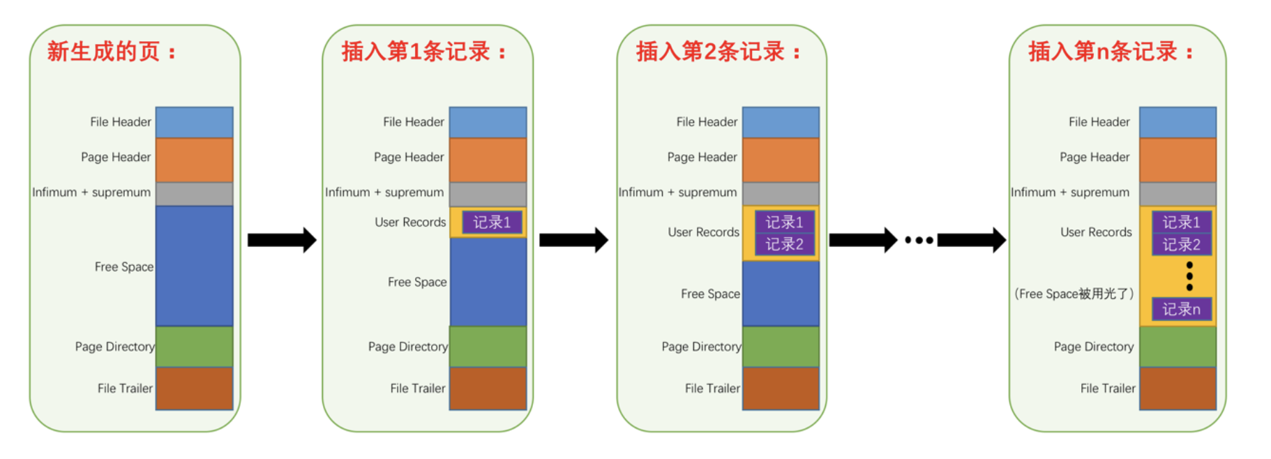 在页的7个组成部分中,我们自己存储的记录会按照我们指定的 行格式 存储到 User Records 部分。但是在一开始生成页的时候,其实并没有 User Records 这个部分,每当我们插入一条记录,都会从 Free Space 部分,也就是尚未使用的存储空间中申请一个记录大小的空间划分到 User Records 部分,当 Free Space 部分的空间全部被 User Records 部分替代掉之后,也就意味着这个页使用完了,如果还有新的记录插入的话,就需要去申请新的页了,这个过程的图示如下: