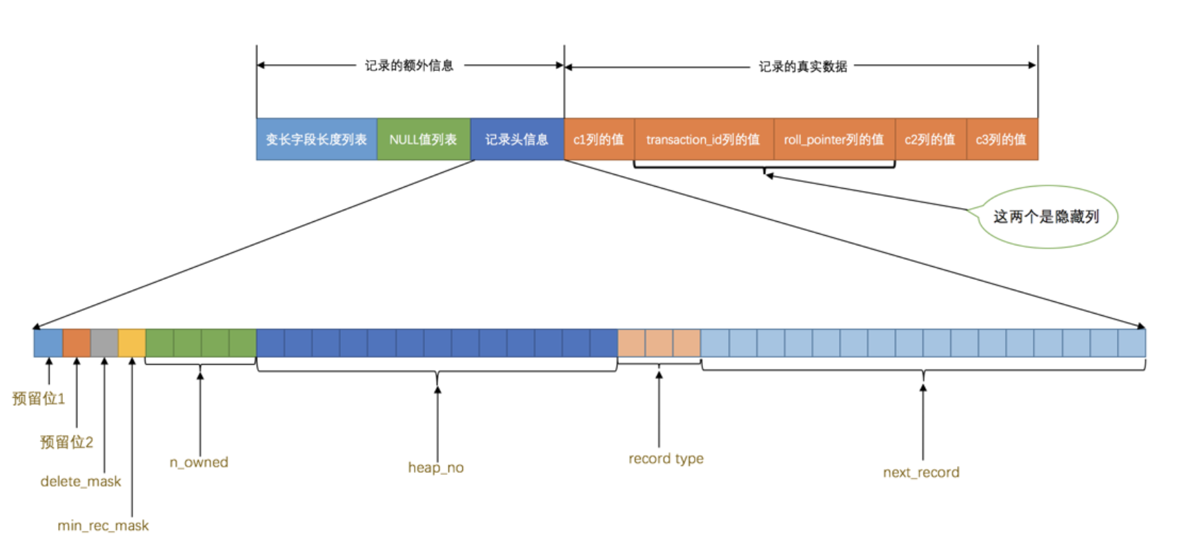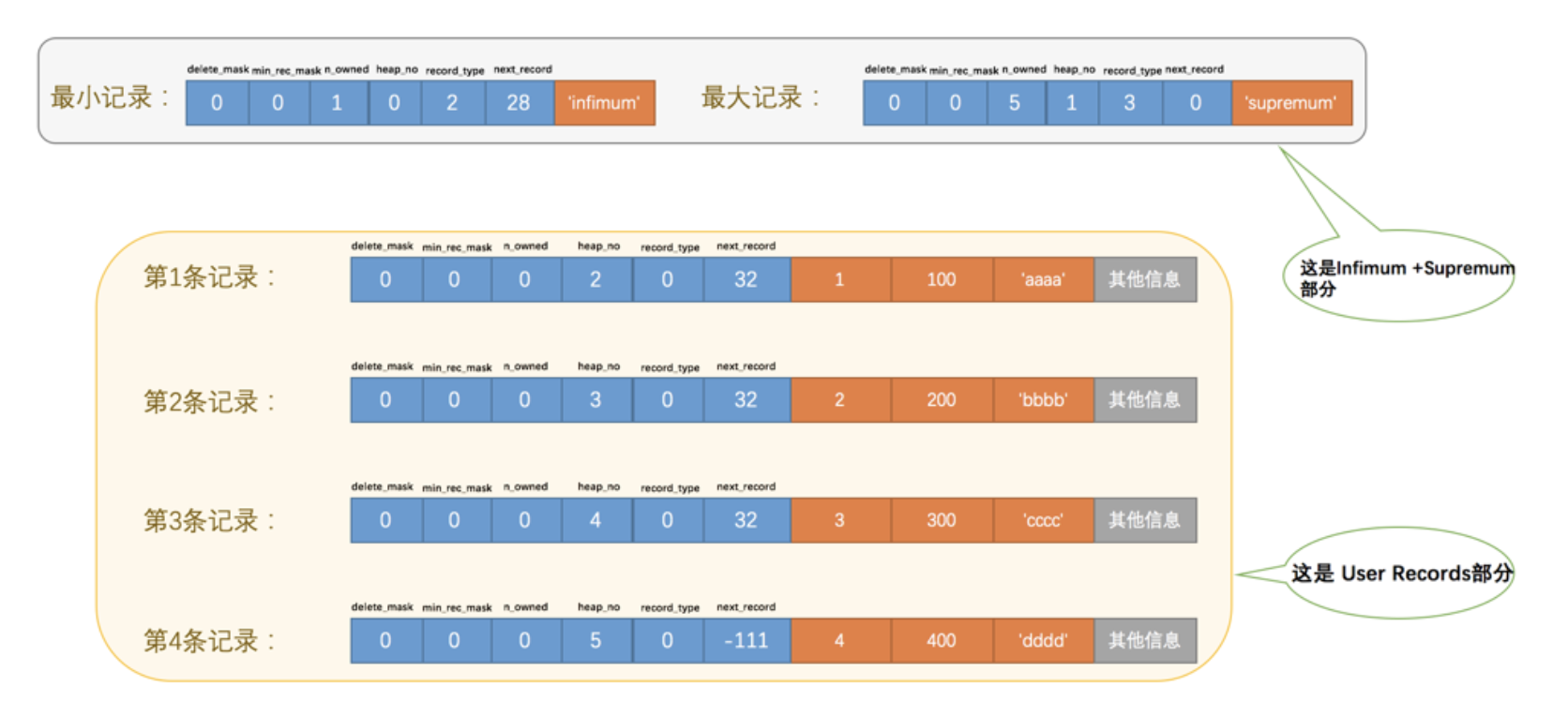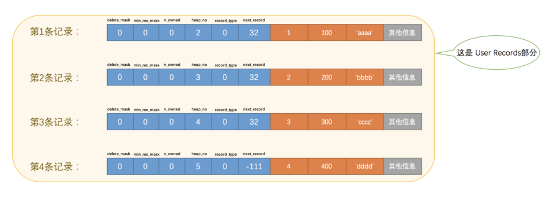 看这个图的时候需要注意一下,各条记录在 User Records 中存储的时候并没有空隙,这里只是为了大家观看方便才把每条记录单独画在一行中。我们对照着这个图来看看记录头信息中的各个属性是啥意思: