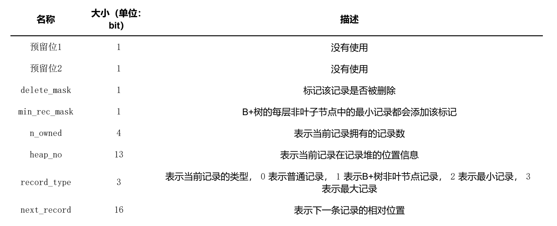 这个属性表示当前记录的类型,一共有4种类型的记录, 0 表示普通记录, 1 表示B+树非叶节点记录, 2 表示最小记录, 3 表示最大记录。从图中我们也可以看出来,我们自己插入的记录就是普通记录,它们的record_type 值都是 0 ,而最小记录和最大记录的 record_type 值分别为 2 和 3 。至于 record_type 为 1 的情况,我们之后在说索引的时候会重点强调的。next_record: