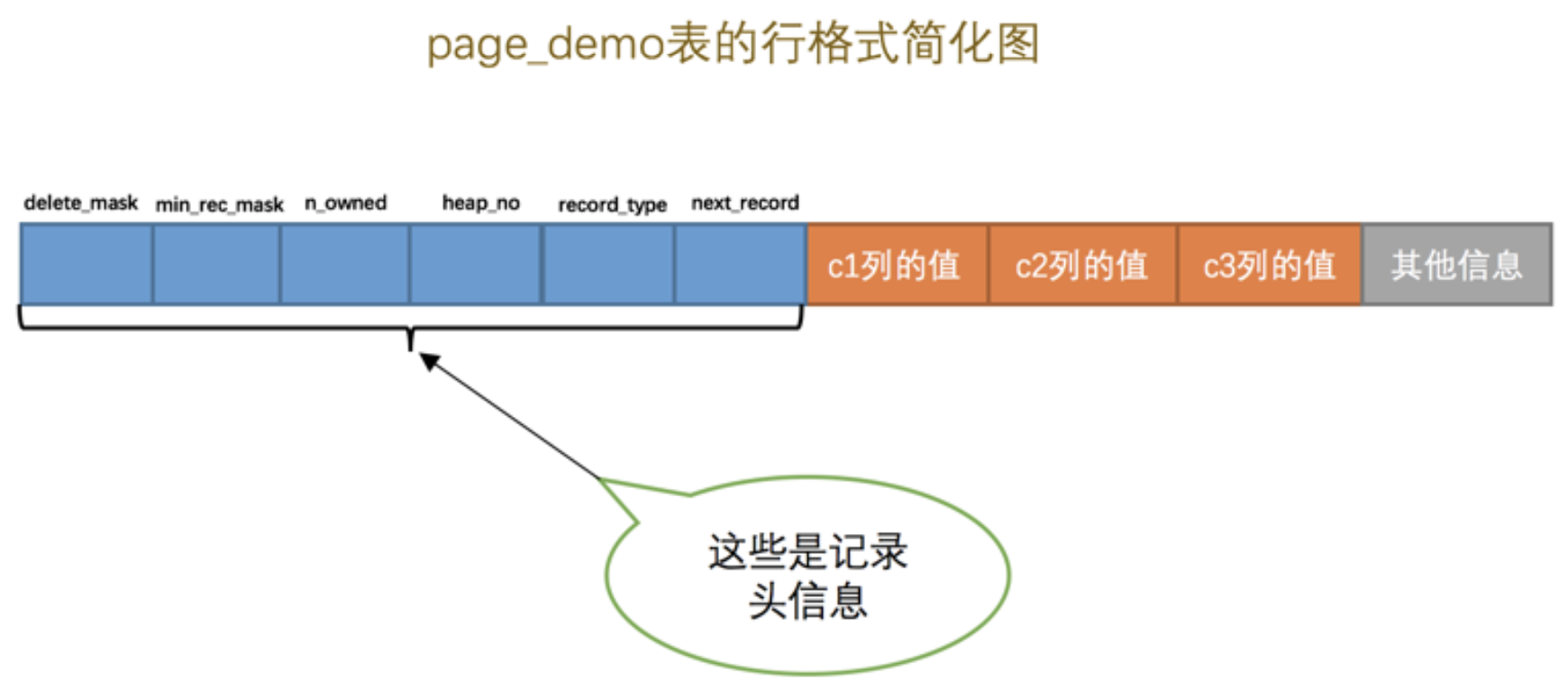 由于我们现在主要在唠叨 记录头信息 的作用,所以为了大家理解上的方便,我们只在 page_demo 表的行格式演示图中画出有关的头信息属性以及 c1 、 c2 、 c3 列的信息(其他信息没画不代表它们不存在啊,只是为了理解上的方便在图中省略了~),简化后的行格式示意图就是这样: