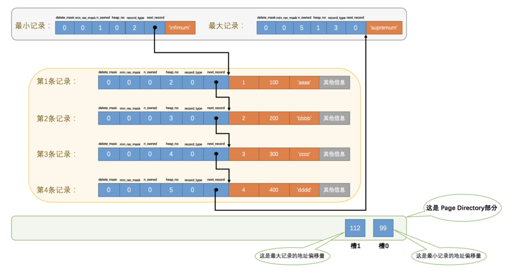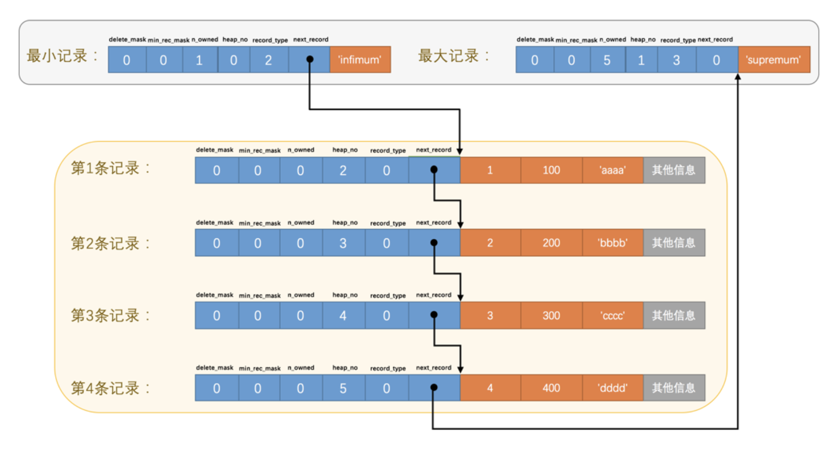 但是需要注意注意再注意的一点是, 下一条记录指得并不是按照我们插入顺序的下一条记录,而是按照主键值由小到大的顺序的下一条记录。而且规定 Infimum记录(也就是最小记录) 的下一条记录就是本页中主键值最小的用户记录,而本页中主键值最大的用户记录的下一条记录就是Supremum记录(也就是最大记录),为了更形象的表示一下这个next_record起到的作用,我们用箭头来替代一下 next_record 中的地址偏移量:伪记录(Infimum+Supremum) #