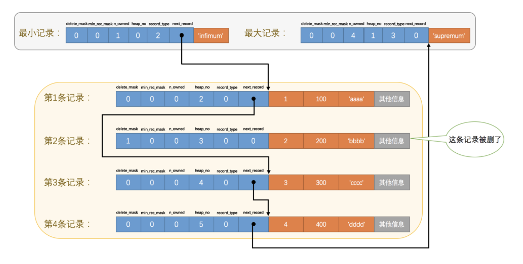 2). 第2条记录的 next_record 值变为了0,意味着该记录没有下一条记录了。