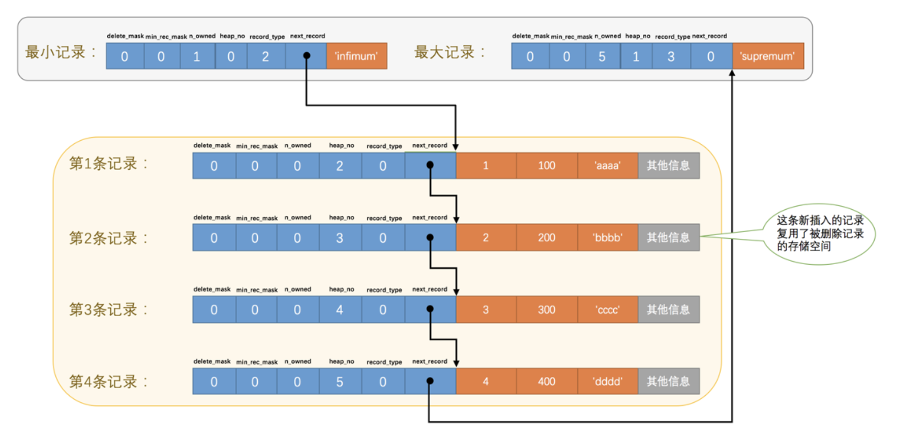 从图一中可以看出来,我们的记录按照主键从小到大的顺序形成了一个单链表。 最大记录 的 next_record 的值为 0 ,这也就是说最大记录是没有 下一条记录 了,它是这个单链表中的最后一个节点。