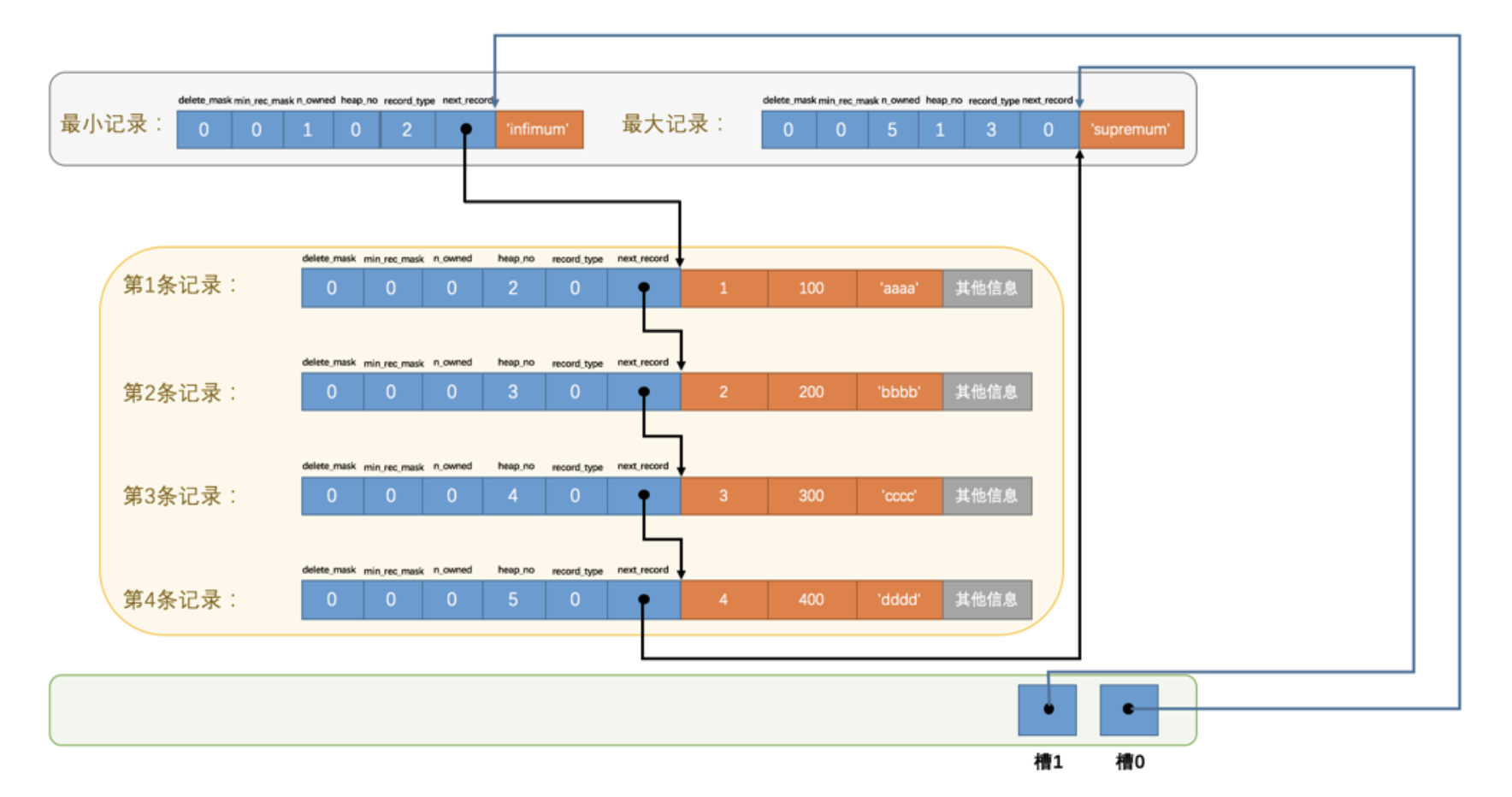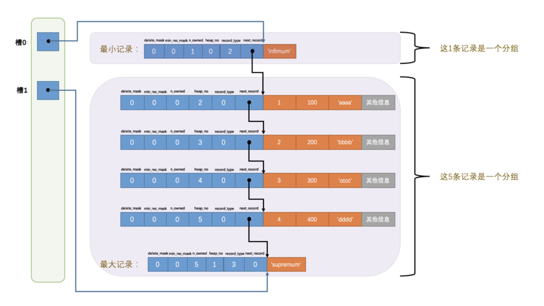 2.1).最小记录的 n_owned 值为 1 ,这就代表着以最小记录结尾的这个分组中只有 1 条记录,也就是最小记录本身。